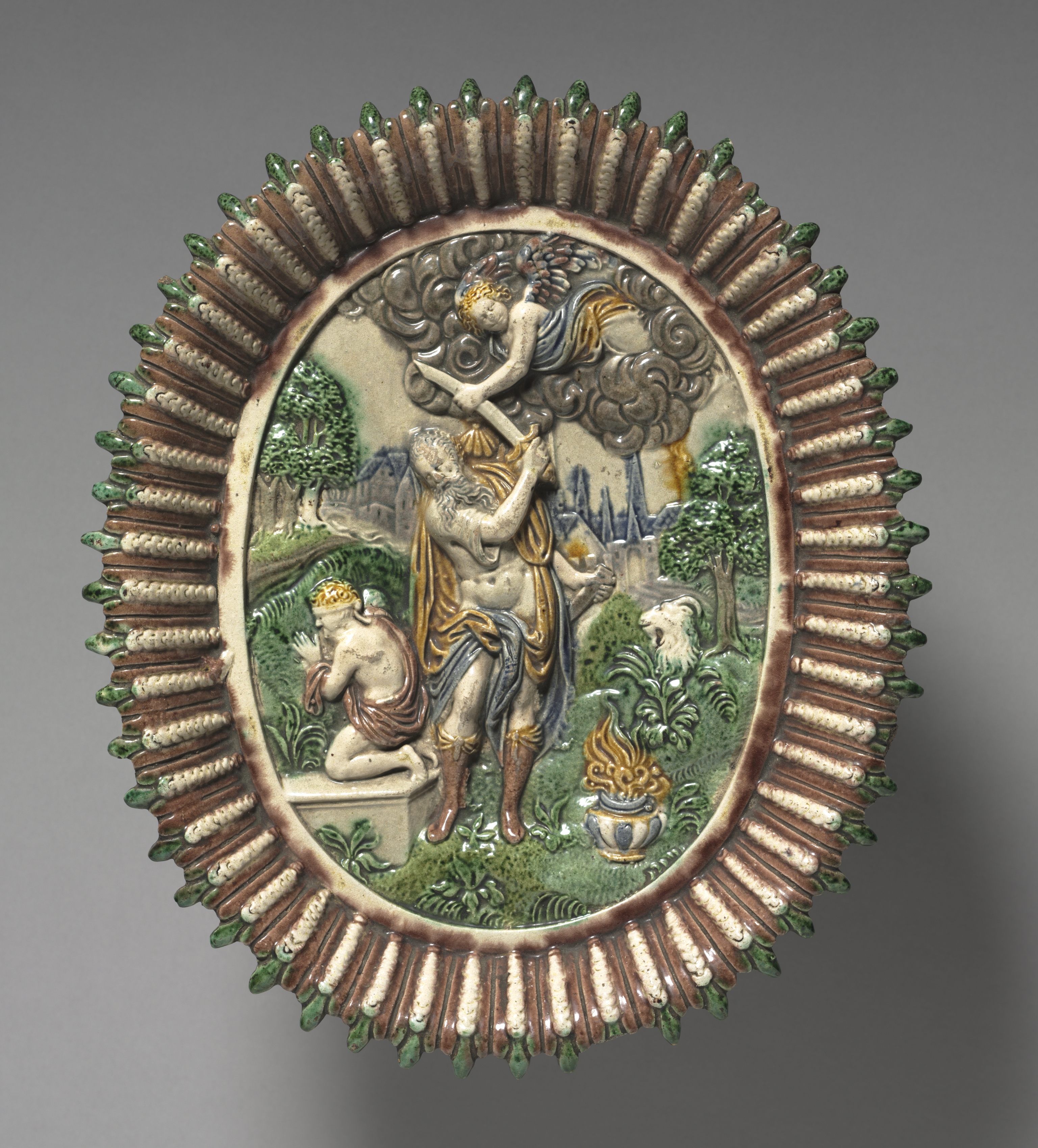 Oval ceramic plate with a brown and green glazed rim featuring pointed projections. The plate's central scene depicts a biblical story: a bearded man, wearing a blue and gold cloth wrapped around his waist, holds a young boy over an altar. The boy has curly hair and is nude. A kneeling youth with curly hair and a cloth around his waist looks on. A small fire burns on the altar. A white dog observes from the right. The background features trees, a building, and a tree with curled branches. The scene is rendered in earthy tones with gold accents.