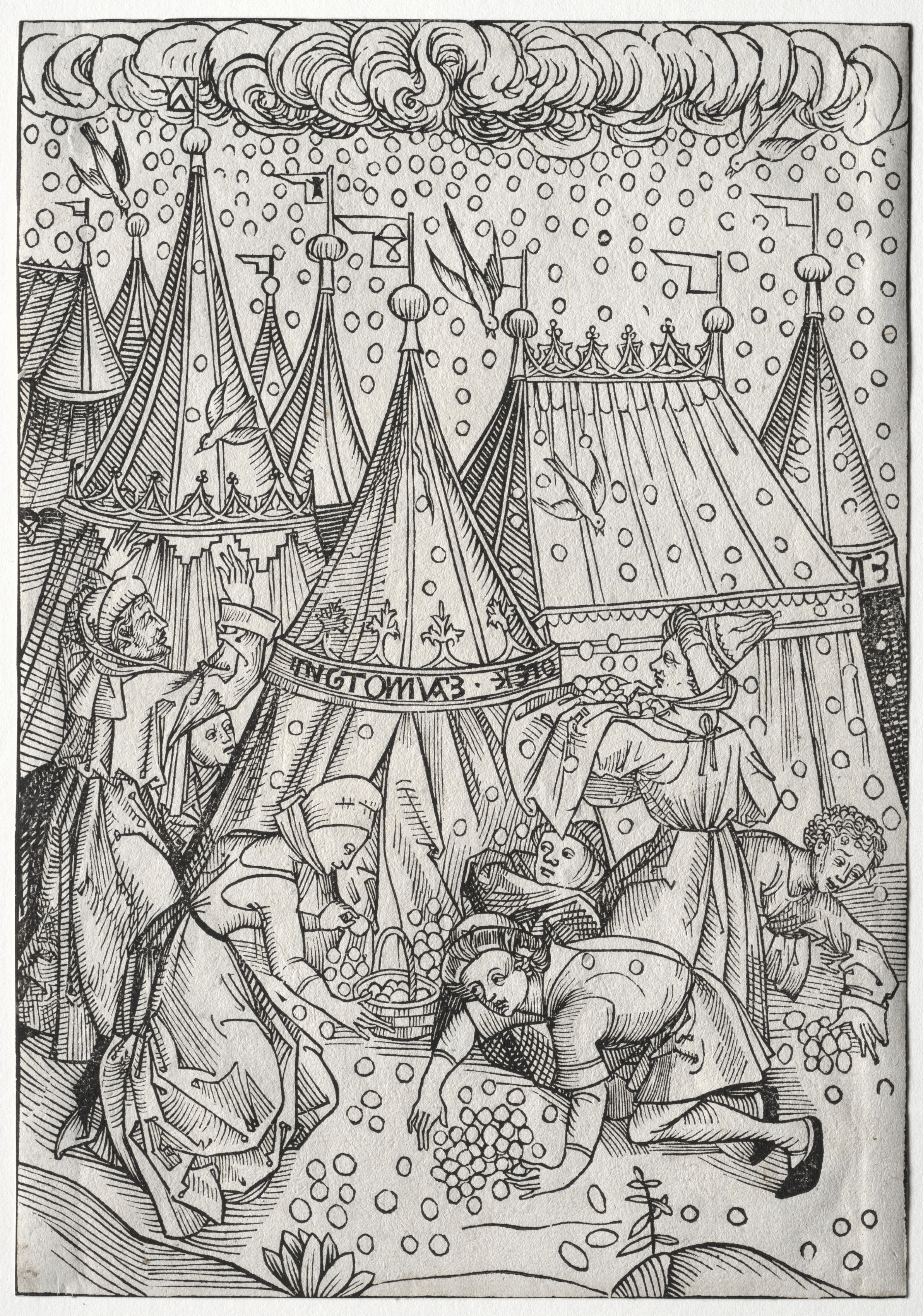 Black and white illustration of people collecting manna. The scene depicts a group of people, some wearing head coverings and robes, gathered around a tent with a banner reading "INGOTOMIAZ" or similar text. One person kneels on the ground collecting manna into a basket. Others stand around, some holding baskets. The background shows several tents or canopies, and the sky has clouds and dots representing manna falling from heaven. The illustration is detailed with lines and shading, characteristic of woodcut art.