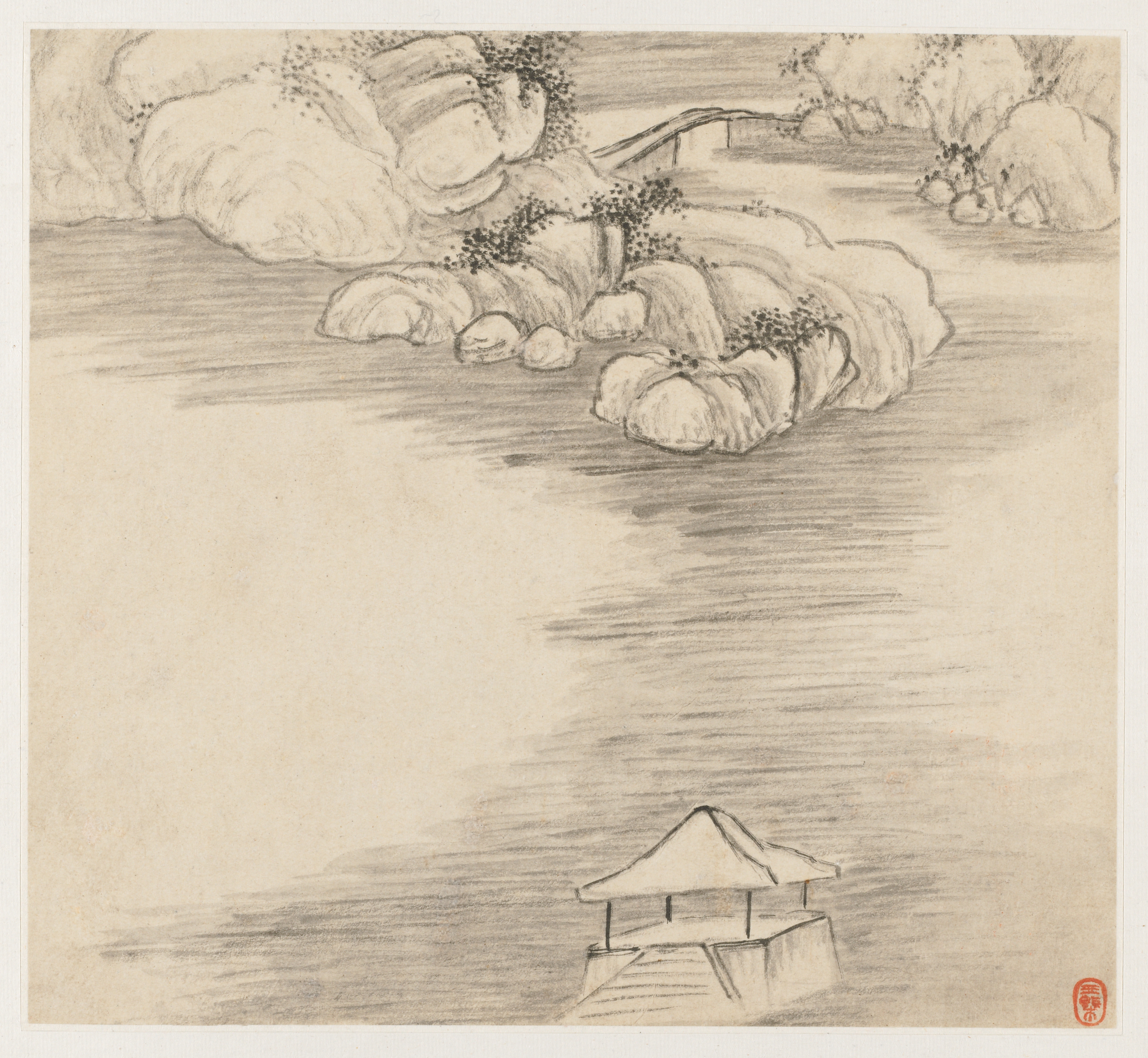 Album of Landscapes: Leaf 3 by Wang Gai. A pencil drawing on beige paper. A body of water fills most of the image. At the top, a group of large boulders with trees growing out of them poke out of the water. A bridge-like structure cuts across to the right behind them. A small house with a triangular roof sits on a platform at the bottom. A red seal stamp sits in the bottom-right corner.