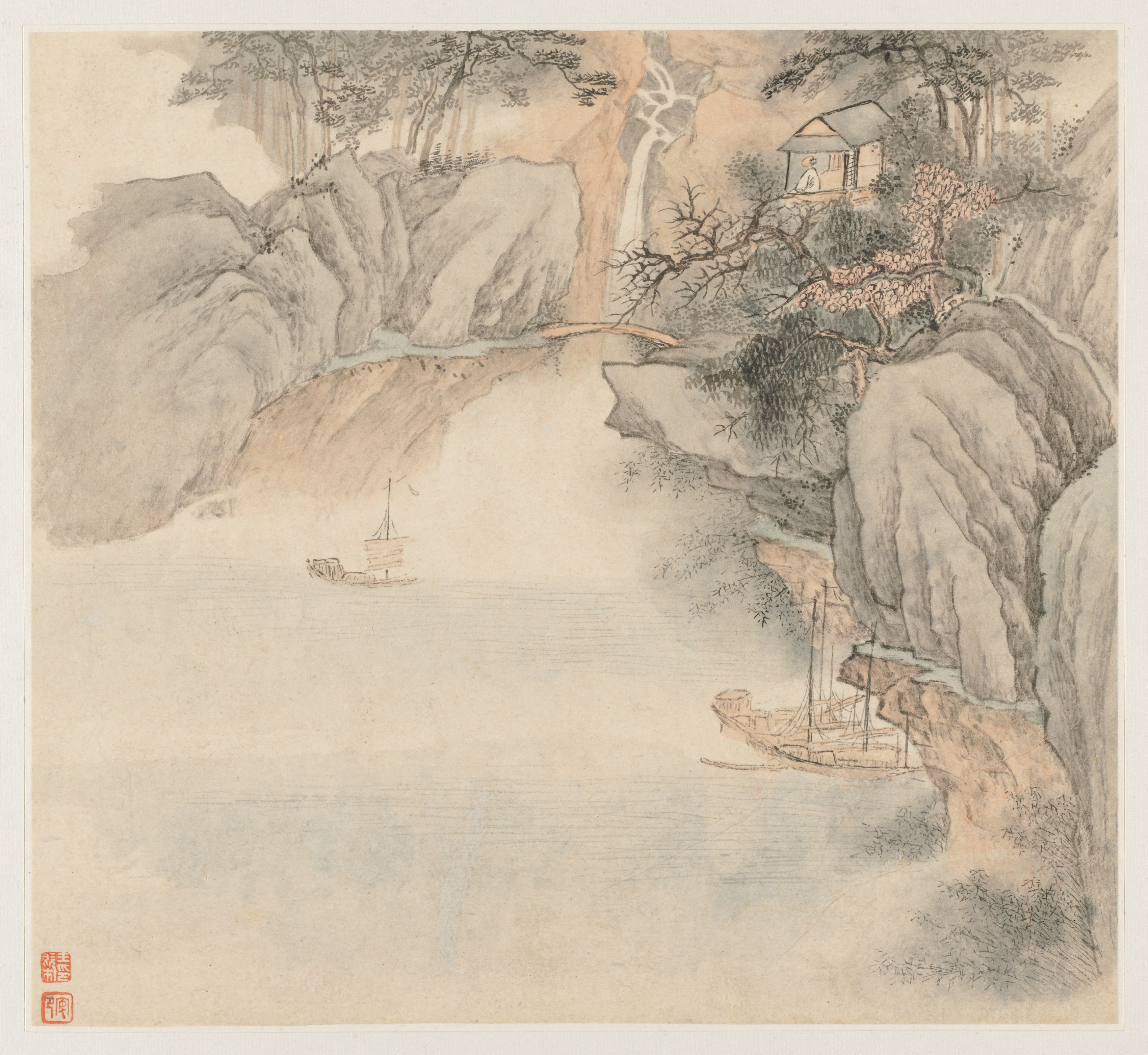 Album of Landscapes: Leaf 4 by Wang Gai. A painting depicts a serene landscape with a body of water and boats. A cliffside with trees and vegetation dominates the right side. A house sits atop the cliff. Two boats are on the water; one near the cliff, the other further away. The color palette includes shades of gray, brown, and beige. The painting features a mix of detailed and subtle brushstrokes. Two red stamps are in the bottom left corner.