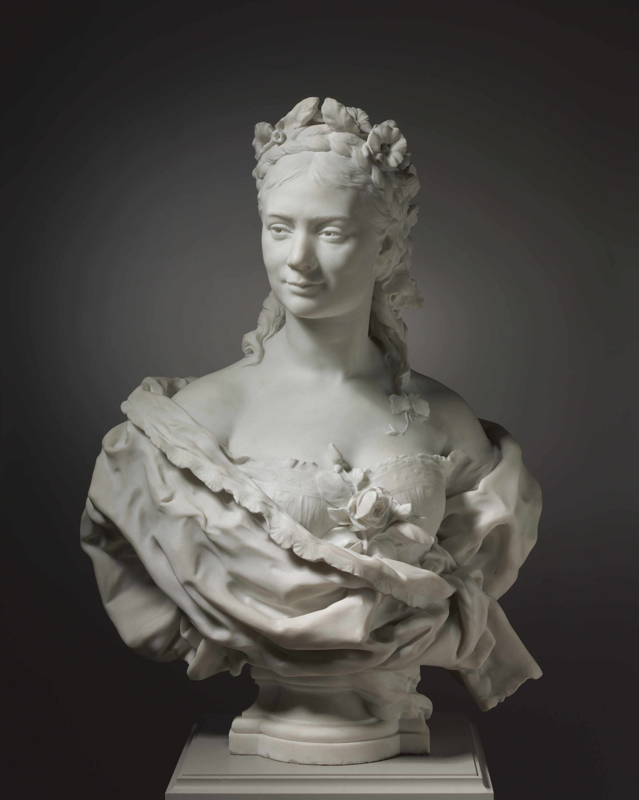 White marble bust of a woman with a floral headpiece, gown with puffy sleeves, and a rose on her chest. The bust is on a square base. The woman has curly hair and is looking to her left. Her gown has a low neckline and appears to be made of flowing fabric. The background is dark gray and fades to white.