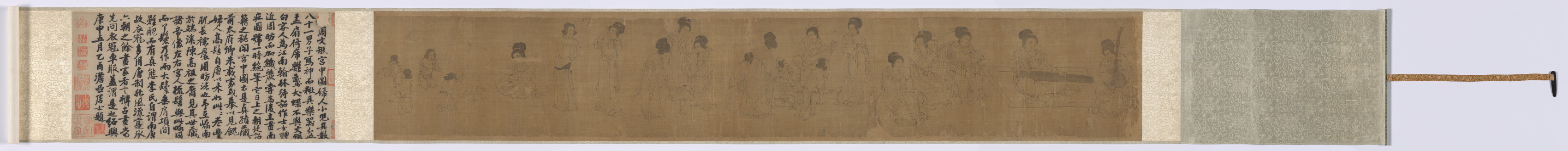 The image shows a long, horizontal scroll titled "In the Palace" by Zhou Wenju. The scroll is divided into sections. The left section contains black Chinese calligraphy on beige background, bordered by narrow beige and red strips. The central section depicts a group of people in a palace scene on a brown background and appears to be a drawing or painting. The right section is a beige fabric border. A brown stick protrudes from the right side. The scroll is set against a white background.