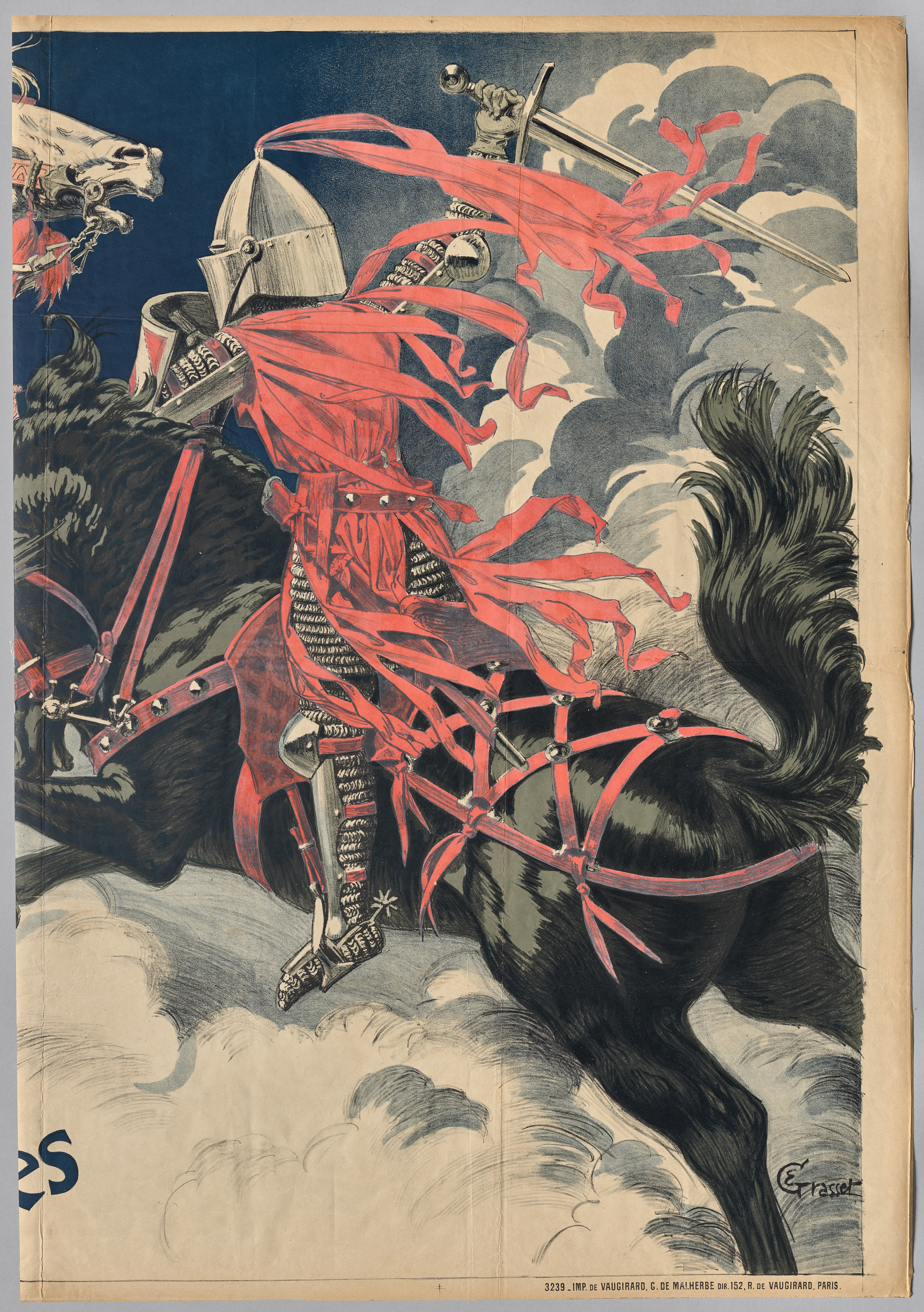 The artwork is titled "Andalusia at the Time of the Moors" and is by Eugène Grasset. The image depicts a man in armor on a dark-colored horse, viewed from the side. The horse faces left; its head and neck are cropped on the left edge. The horse has a long tail with a bushy end, and its bridle and saddle are red leather with metal accents. The rider sits on a high saddle and wears a helmet with a nose guard, a red cape flowing behind him, and tunic and leggings with vertical black and white stripes. He holds a sword over his shoulder in his right hand. A second horse's head and neck are visible at the upper left. The background features a blue sky with gray clouds. A signature appears in the bottom-right corner. Small text appears along the bottom edge.