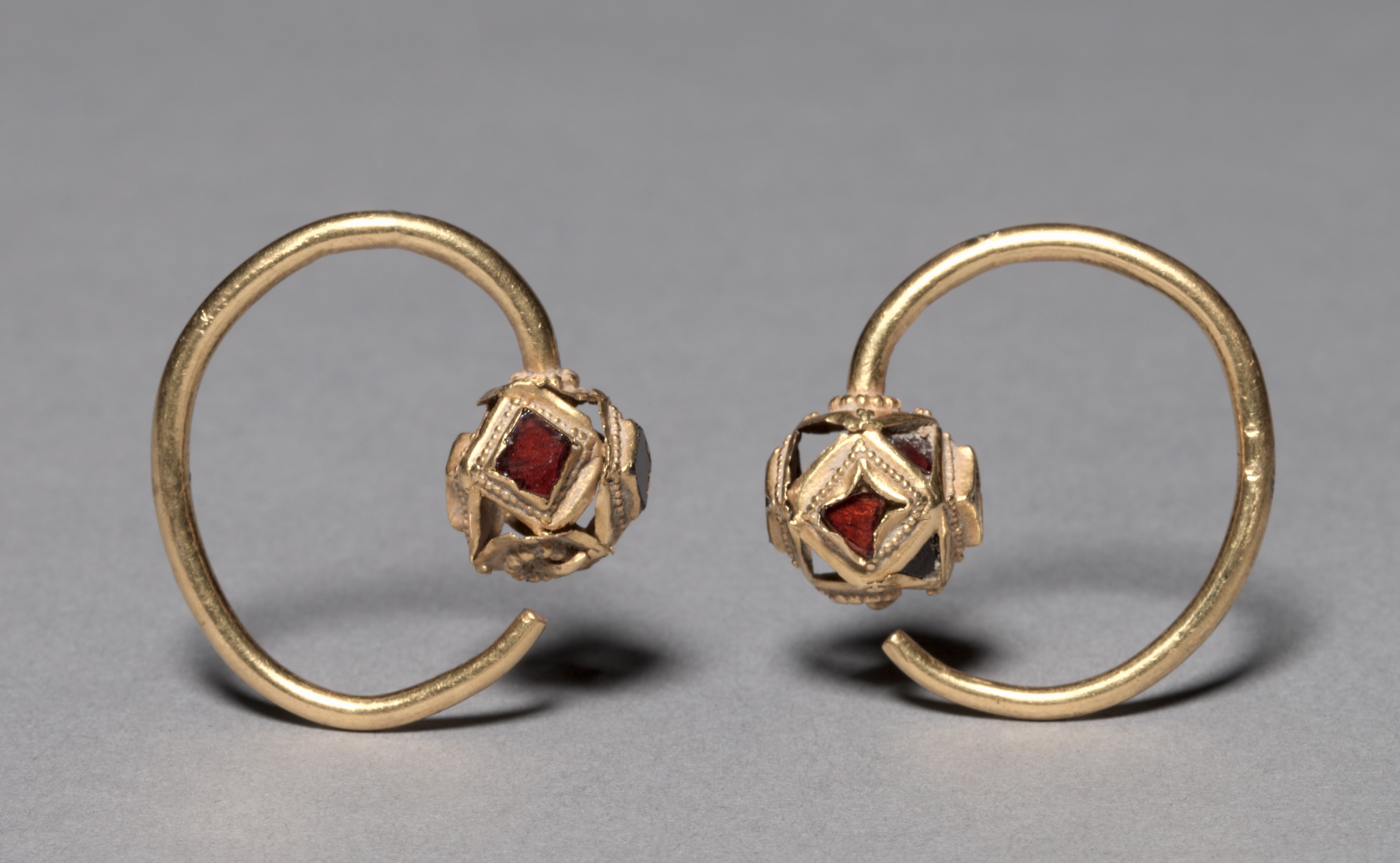 The earrings are a pair of gold hoop earrings. The hoops are circular and made of gold. A decorative gold piece is attached to the center of each hoop. The decorative pieces are shaped like a sphere's projection and have a red gemstone in the center. The gemstones are square-shaped and surrounded by a gold lattice pattern. The earrings have a textured surface, with visible signs of wear. The background of the image is gray.