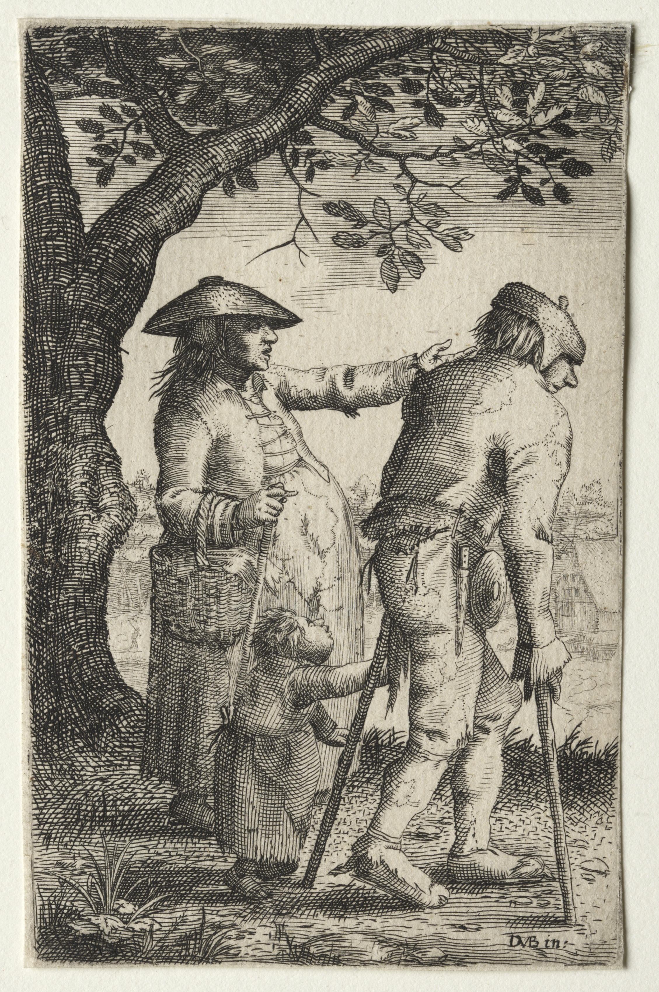 The image shows a black and white drawing titled "Peasant Family" by David Vinckboons. The drawing depicts a woman wearing a wide-brimmed hat and a long dress, and holding a basket. She stands on the left and looks to the right with her right hand on the shoulder of a man. The man wears a hat and has his back to the viewer; he holds two crutches. A small child stands between them, looking up at the woman. The three people stand under a tree with a thick trunk on the left. The background shows a landscape with buildings and a sky.
