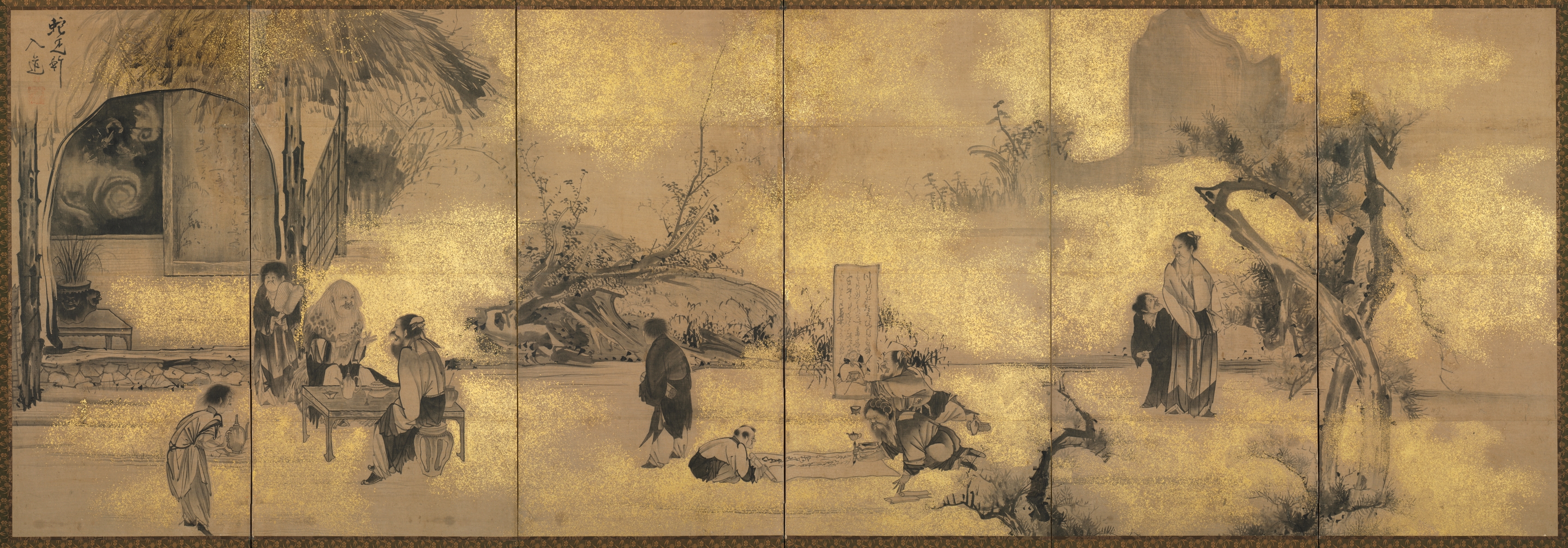 The image depicts a six-panel folding screen with a gold background and black and white illustrations. The panels are arranged side by side. The scene shows people dressed in traditional Japanese clothing in a landscape. There are trees, plants, and a large rock on the left. A large tree with sparse foliage is on the right. The left panel shows an archway with a painting inside. A low table and a pot with plants are to the right of the archway. A child holds a jug near the archway. Three people stand near a low table with items on it. The second panel from the left shows a man standing and holding an object. A person sits on the ground in front of him. The third panel from the left shows two people near a low table. A person sits on the ground. The fourth panel from the left shows two people standing. The fifth panel from the left shows a person sitting on the ground and another sitting on a low chair. The sixth panel from the left shows two people standing near the tree. The background of the panels is gold with darker gold mottling.