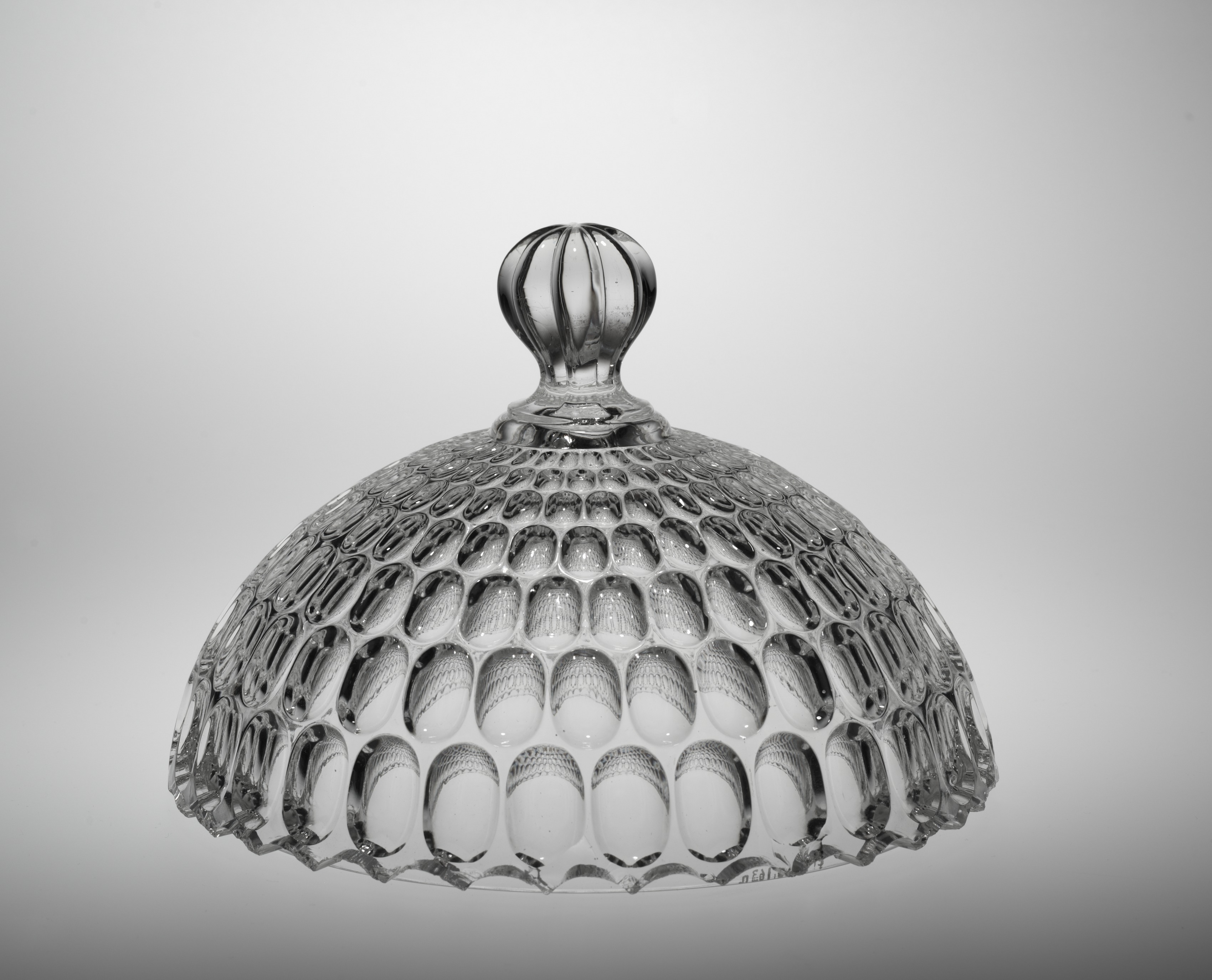 Glass dome-shaped object with a knob on top, featuring a textured surface composed of numerous oval indentations arranged in rows. The object has a rounded shape, with the knob at the top resembling a small, ribbed sphere. The background is gray and white.