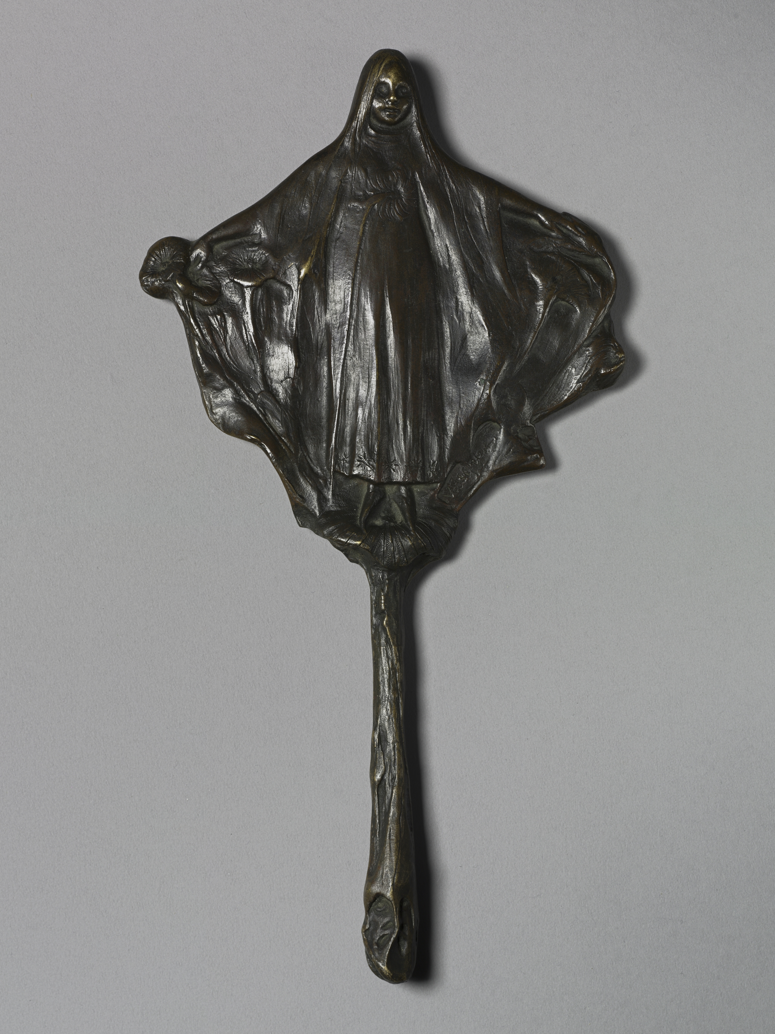 The sculpture depicts a woman with her head covered, wearing a robe that flows around her. She holds a mirror in her left hand. The mirror has a handle with a leaf-like design at the end. The woman is made of dark-colored metal, possibly bronze, with a patina that gives it a dark brown or black color. The background of the image is a plain gray color. The sculpture is titled "Hand Mirror" and was created by Villé Vallgren.