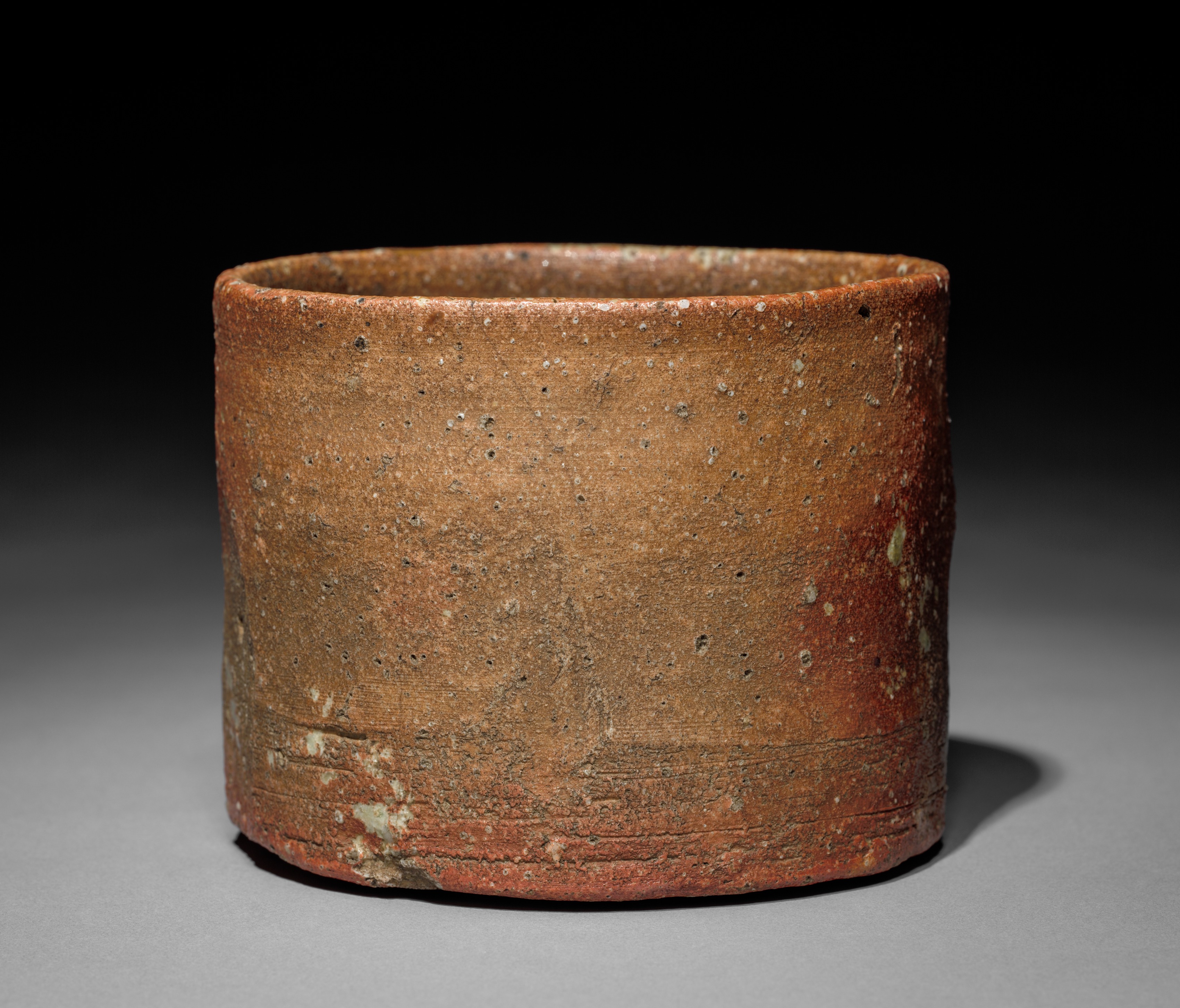 The Tea Bowl by Bernard Leach is a low, wide ceramic bowl with a rough, textured surface. The bowl is cylindrical in shape, with slightly curved sides and a flat bottom. The exterior surface is a warm, earthy brown color with small flecks of white and darker brown speckles throughout. The surface appears to be rough and porous, with visible pitting and small holes. A horizontal line encircles the lower part of the bowl. The interior of the bowl is not visible, but the rim appears to be rough and unglazed. The background is a dark gray gradient, with the bowl casting a shadow on the surface below.