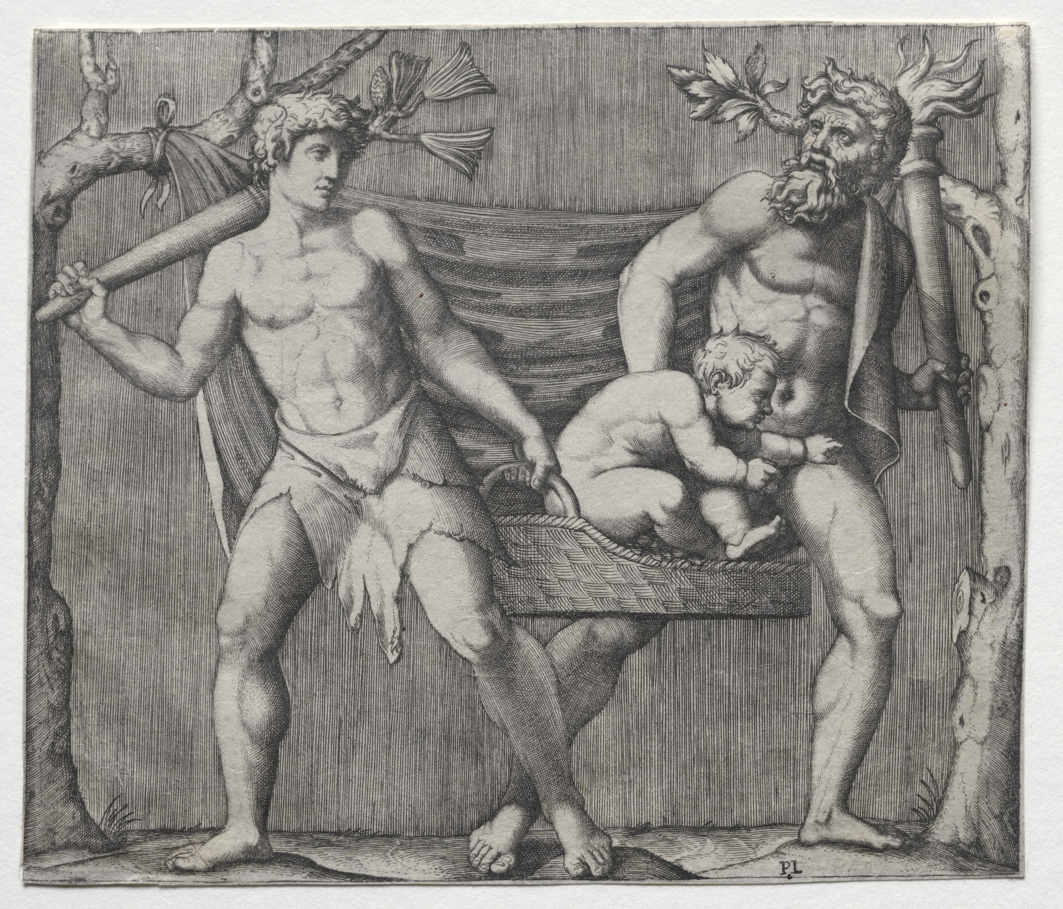 Black and white image of two muscular male figures wearing leafy headpieces and loincloths carry a basket with a child. The figure on the left has one hand on the basket and the other on a long cylindrical object resting on his right shoulder. The figure on the right grasps the basket with one hand and a cylindrical object in the other. The child is naked and positioned towards the right in the basket. Tree branches and a curtain are visible in the background.