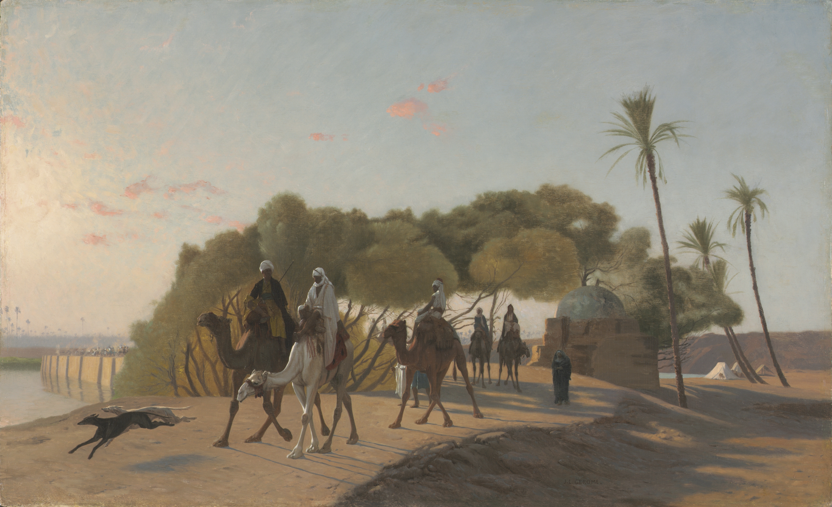 Desert scene with camels and people. A group of people ride on camels. Others walk. A black dog runs. A body of water. A wall to the left. Trees and palm trees. A tent-like structure on right. A domed structure. A blue-gray sky.