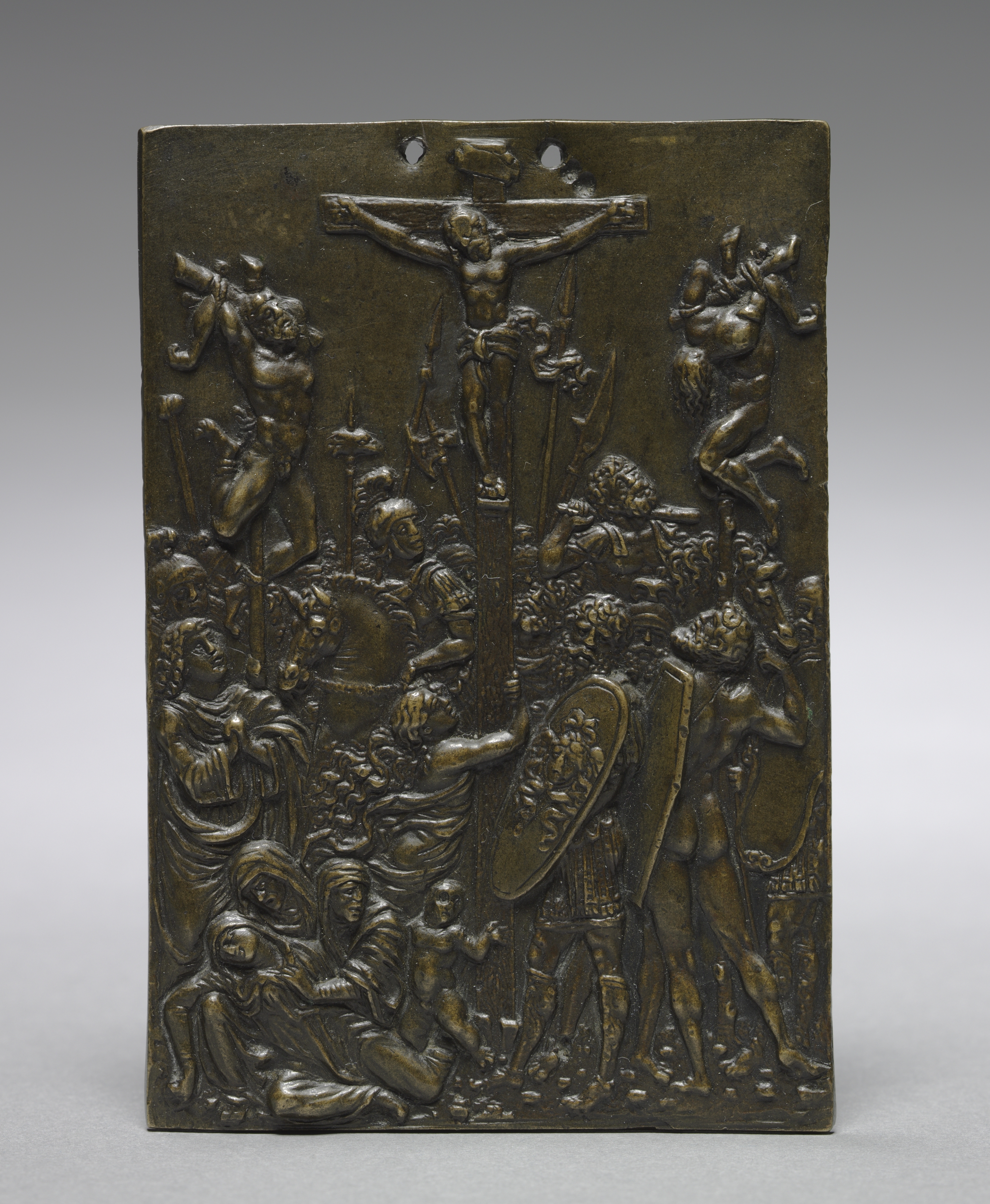 The Crucifixion by Moderno. A rectangular bronze plaque with a raised relief scene. The scene depicts the crucifixion of Jesus Christ on a cross centered at the top. Jesus is naked with a loincloth and his arms outstretched. Two holes are at the top of the plaque, one on either side of the cross. Below Jesus, a crowd of people surrounds the base of the cross. Some figures are dressed as Roman soldiers with helmets and shields. The soldiers have spears and swords. Other figures appear to be mourning or grieving. Some have their hands clasped in prayer. The plaque has a dark brown patina. The background is gray and white.