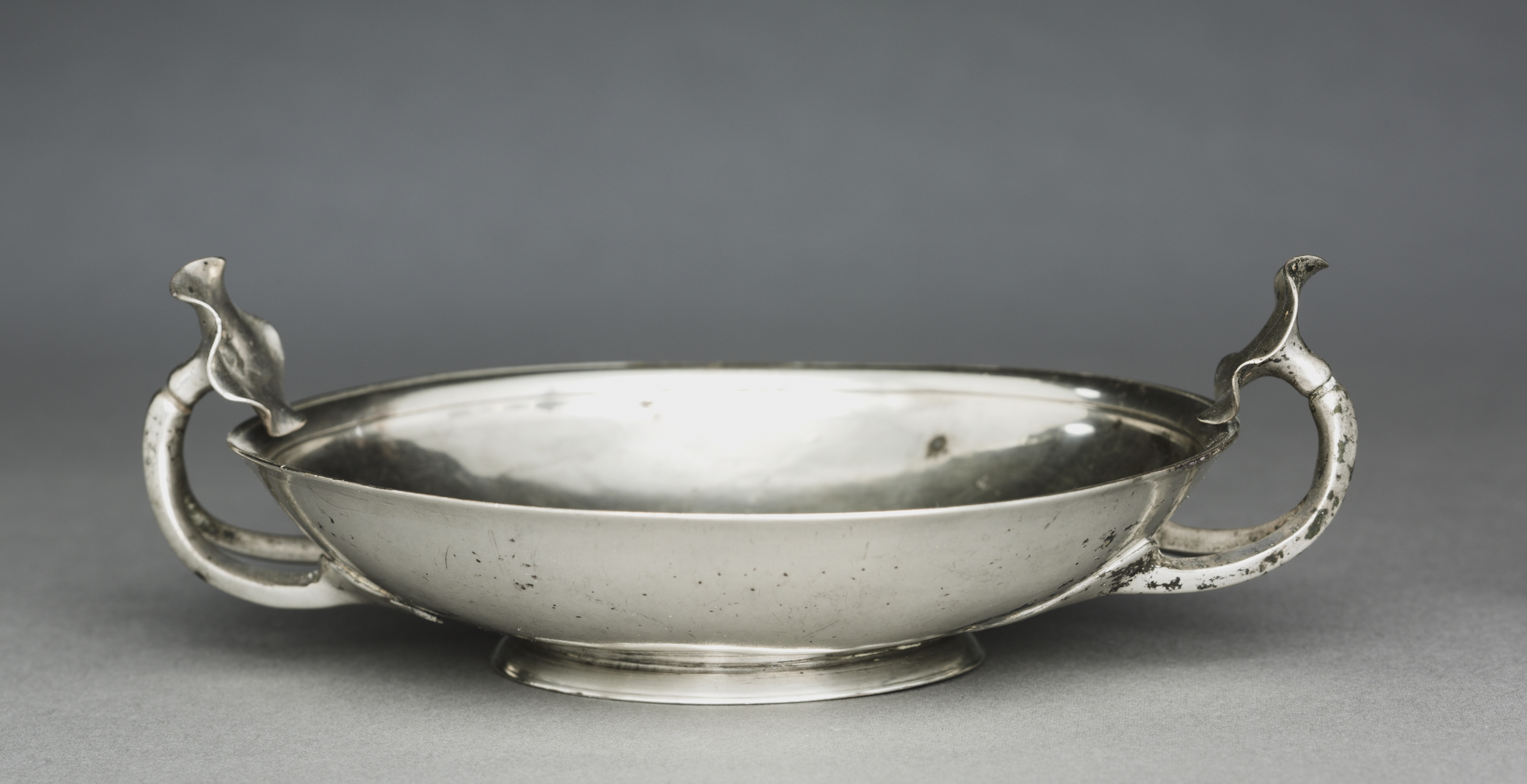 Silver bowl with two handles. The bowl is stemless and has a wide, shallow body with a rounded base. The handles are curved, positioned on either side, and adorned with a bird-like decoration at the top of each handle. The bowl appears to be made of silver or a silver-colored metal, exhibiting signs of wear and aging, including scratches and tarnished areas. The background is a plain gray color. The title of the piece is "Stemless Kylix" by an unknown artist.