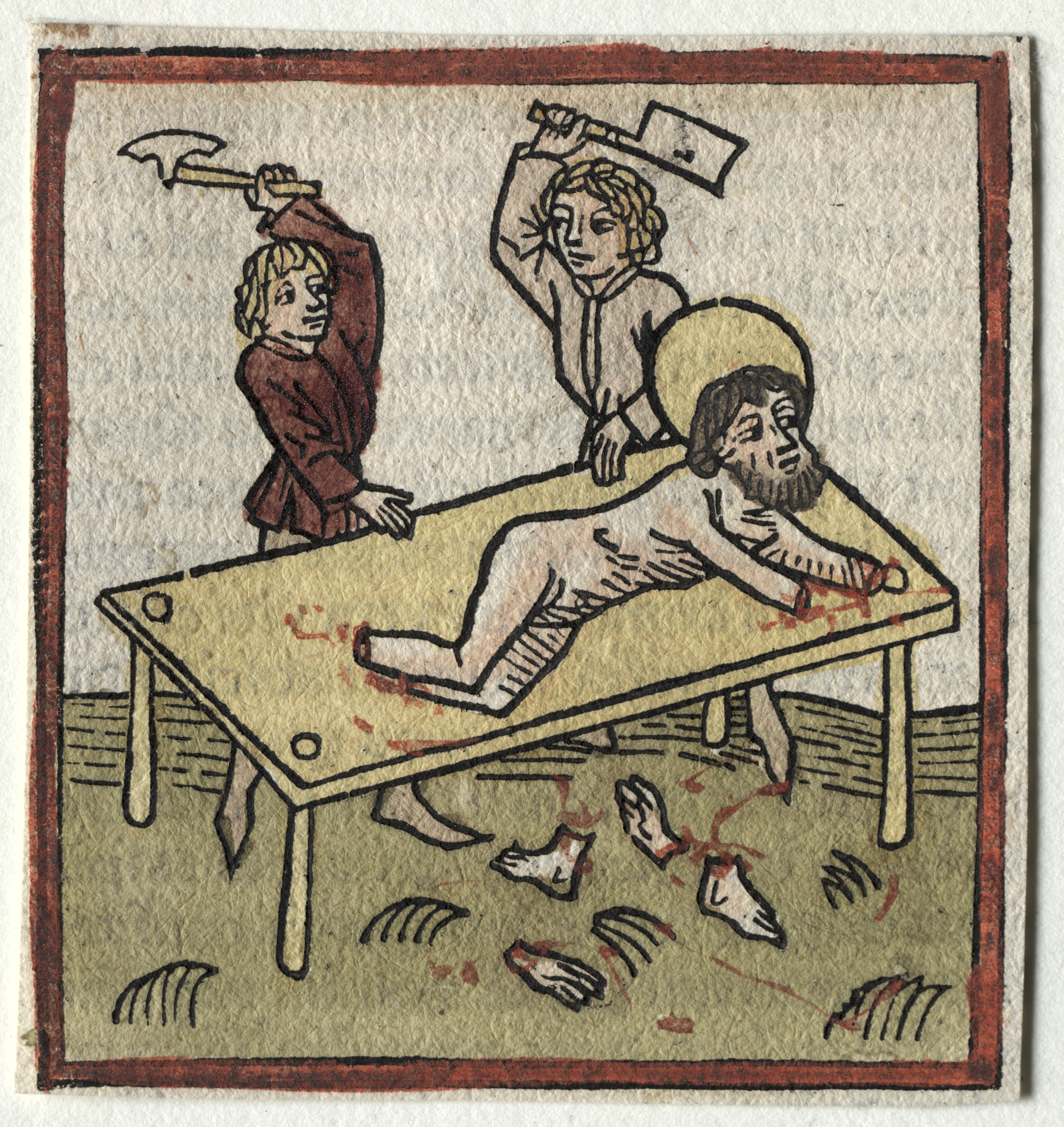 The artwork, titled "St. James" by Günther Zainer, depicts a scene with a man lying on a table. The man on the table is naked with a halo around his head, has a beard and dark hair. He lies on his side on a tan table with his left arm outstretched. Two men stand behind the table. The man on the left wears a red garment and holds an axe. The man on the right wears a light-colored garment and holds a cleaver. The man on the table and the ground have blood on them. The background of the artwork is a light color. The artwork has a red border around it.