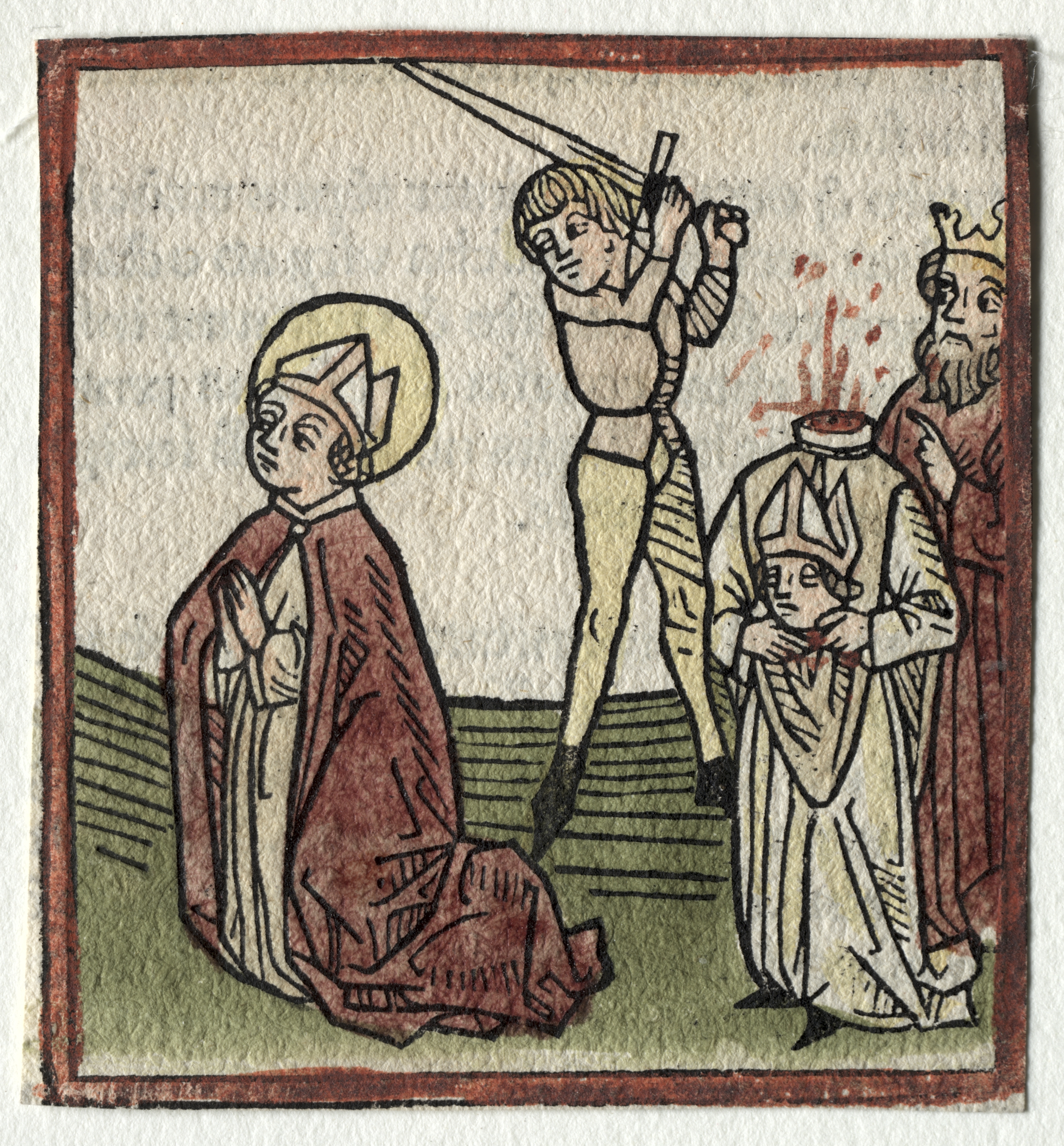 The image depicts a scene with four people. A kneeling man on the left wears a red robe and a mitre, with a halo around his head. He has his hands clasped in prayer. A man stands behind him, holding a sword with both hands, and appears to be about to strike. To the right of the kneeling man, another man in a white robe holds his chest. On the far right, a man with a beard and a crown stands. The background features a green floor and a white wall. The image is framed by a brown border.