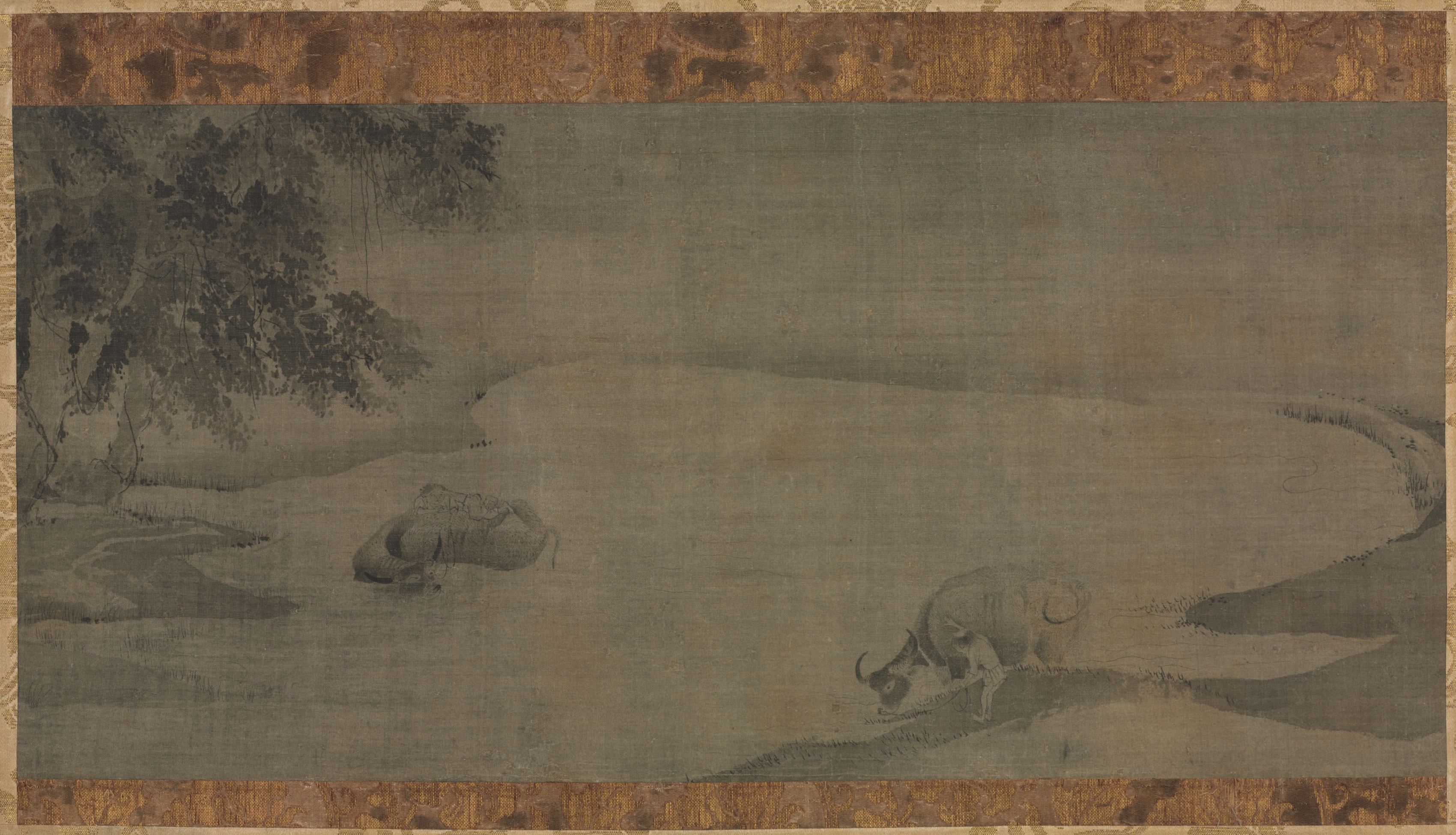 The painting depicts a serene landscape with two water buffalo and two herd boys. The scene shows a body of water with two water buffalo standing on the shore; one is on the right side of the painting and the other on the left. A small figure of a herd boy is standing next to the buffalo on the right. Another herd boy is lying on the ground beside the buffalo on the left. The background features a tree on the left side and a winding path or shoreline that curves around the body of water. The painting's color palette is predominantly muted shades of brown and gray. A brown border with a patterned design frames the top and bottom of the painting.