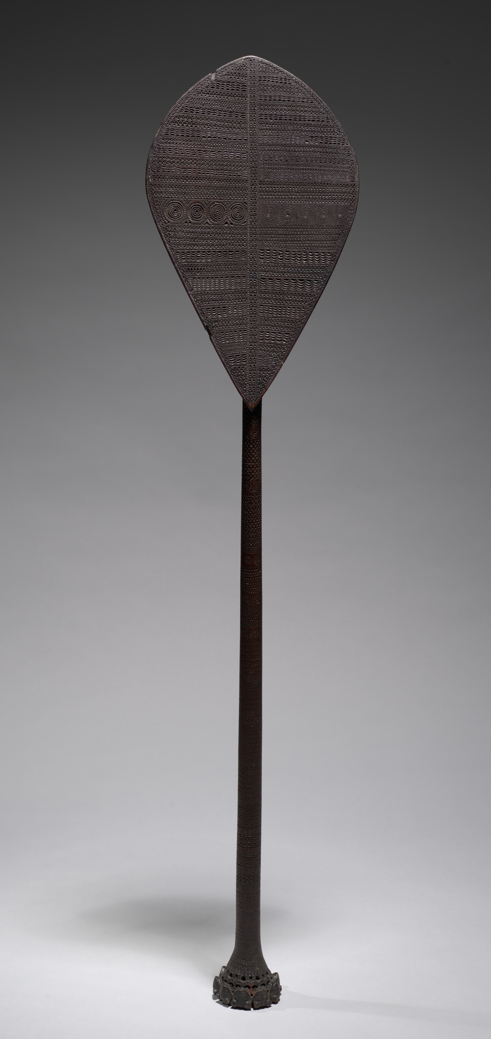 The Ceremonial Paddle by Northwest Coast artist, is a long, slender object with a teardrop-shaped head. The head of the paddle is dark brown with a textured surface featuring various patterns and designs. A long, thin handle extends from the bottom of the head, ending in a decorative base. The background of the image transitions from dark gray at the top to light gray at the bottom, with a subtle shadow cast by the paddle on the surface below.