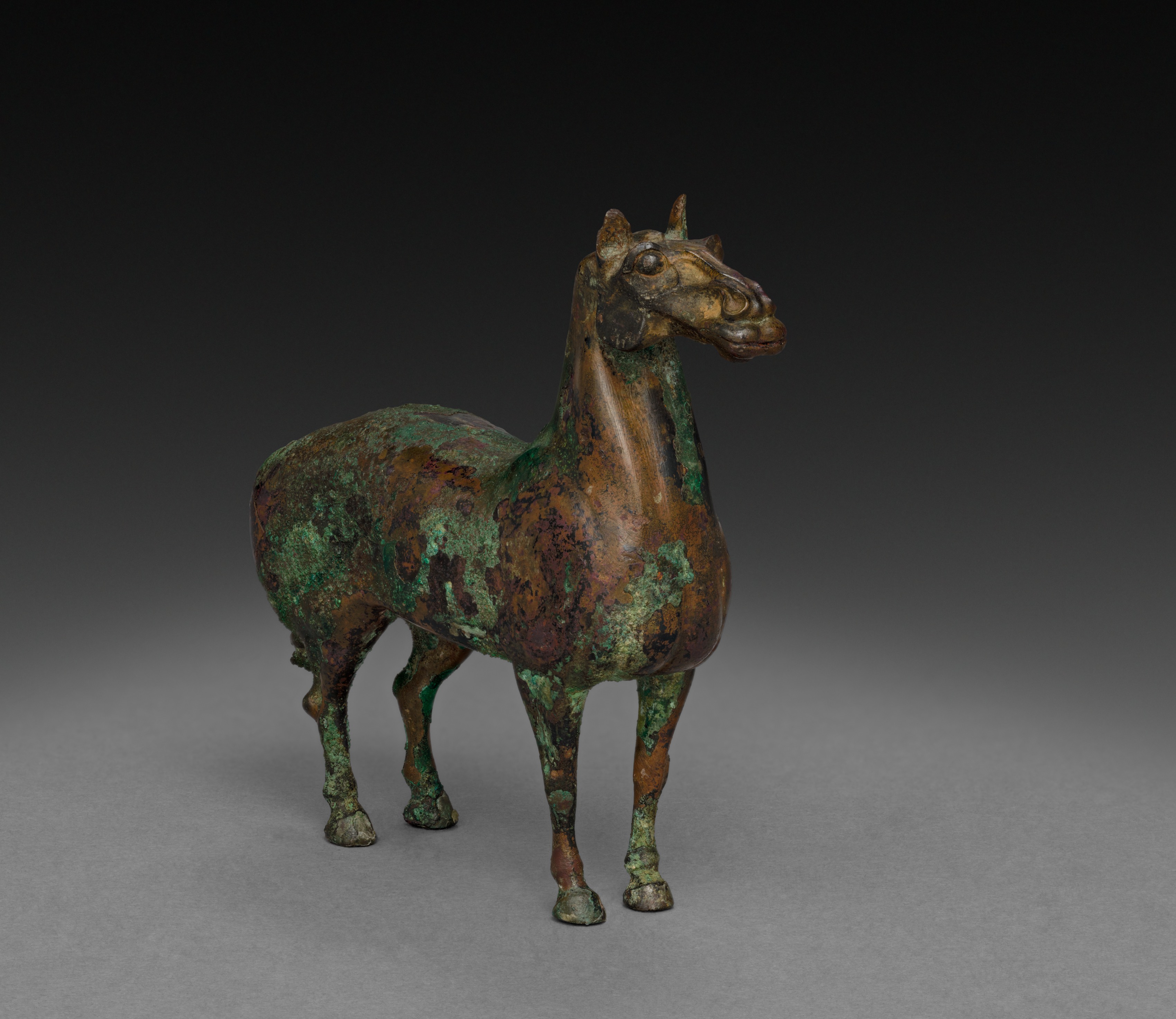 The Standing Horse, created by Unknown Artist, is a bronze sculpture of a horse. The horse stands on all four legs, with its head turned to the right. The sculpture has a dark brown patina with green patches, indicating age and oxidation. The horse's body is depicted in a standing position, with its front and back legs straight. The head is held high, with the ears pointed upwards. The sculpture appears to be made of bronze, with a rough, textured surface. The background of the image is a gradient of black to gray, which helps to highlight the details of the sculpture.