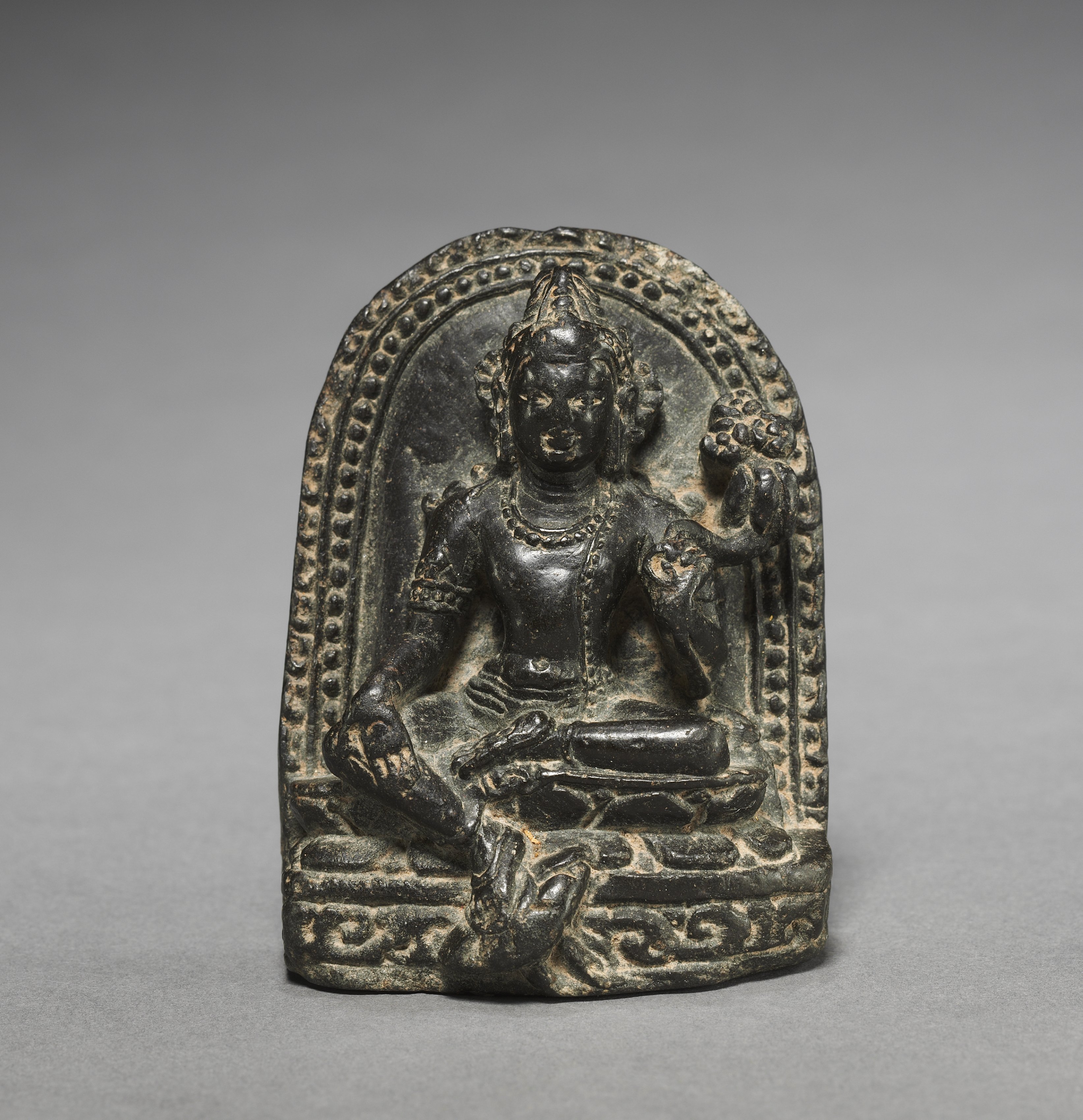 Stele with Padmapani. A small, dark grey stone carving depicting a seated figure. The figure sits cross-legged on a lotus flower base with one leg resting on top of the other. The figure has an elongated head with a high topknot, adorned with a beaded necklace and earrings. The right arm is bent at the elbow with the hand facing outwards, while the left hand holds a lotus flower. The figure wears a long-sleeved garment. The carving features intricate details, including a decorative border around the figure and a patterned base. The background of the image is a plain grey color.
