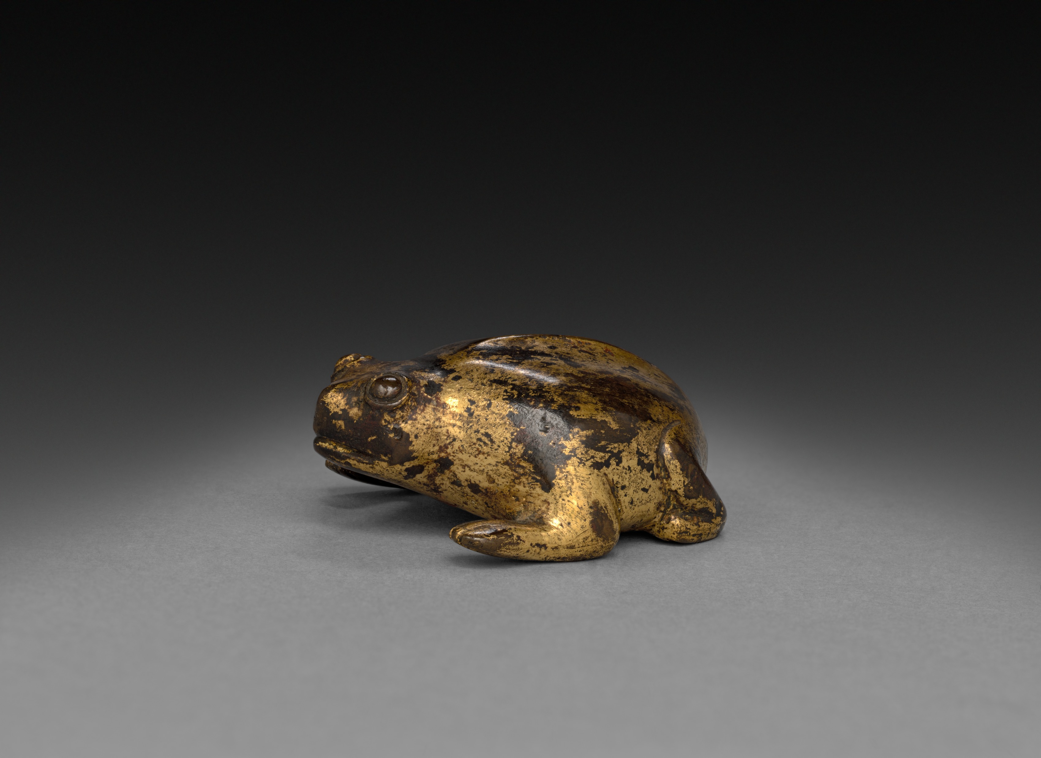 The sculpture depicts Toad by artist Joseph Cornell. It shows a small, bronze sculpture of a toad or frog. The sculpture is sitting on its haunches, facing left. It has a large head, small eyes, and a wide mouth. The bronze is worn and has a gold-colored patina with black spots. The background is a gradient from black at the top to gray at the bottom. The sculpture sits on a gray surface.