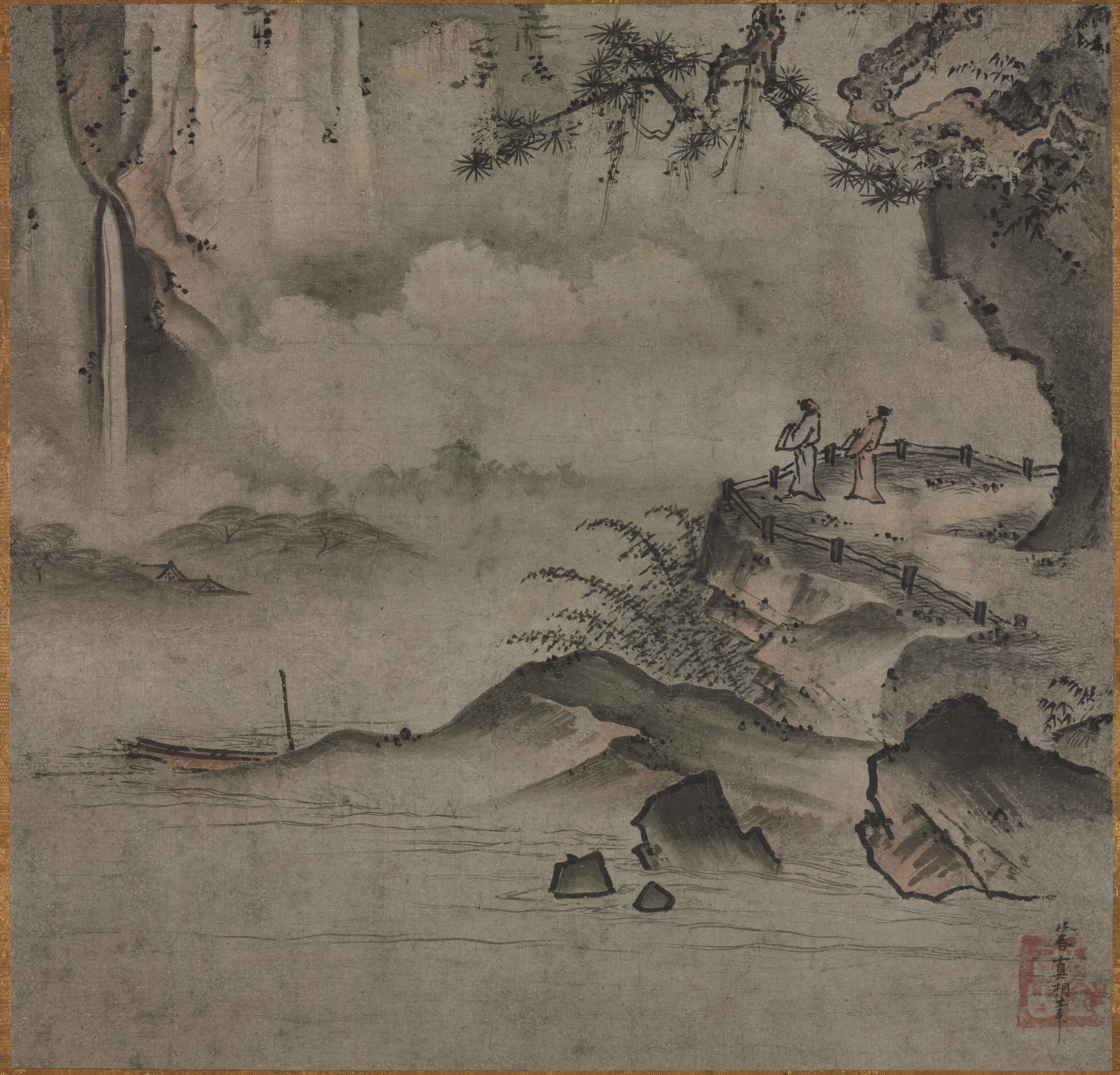 A serene landscape painting depicting two people standing on a cliffside platform overlooking a body of water. The cliffside has a wooden railing and sparse vegetation. A boat is on the water to the left. In the background, there is a large waterfall on the left and a mountainous terrain. The painting features a predominantly gray color palette with subtle brown and black accents. A red seal is in the bottom-right corner. The style is traditional Asian art.