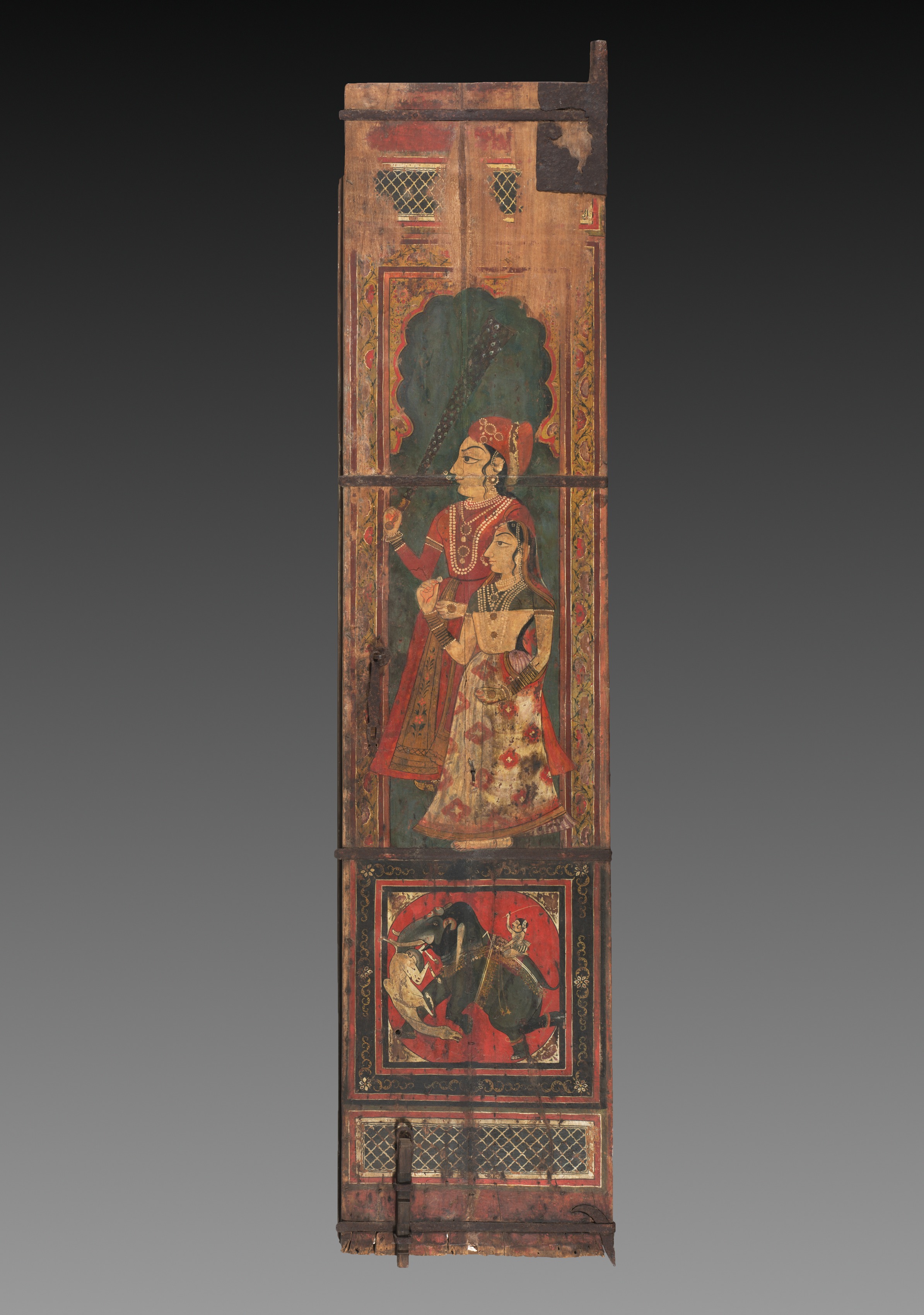 The image shows a vertical, rectangular object with a painted design titled "Painted Door" by an unknown artist. The object has a light-brown background with a darker brown border around the edges and appears to be made of wood. It is divided into sections by horizontal lines. The top section features two small diamond-shaped windows with a lattice pattern. Below the windows is a large archway with a green background. Inside the archway are two people dressed in traditional Indian clothing. The person on the left wears a red and white outfit with a pink turban and holds something in their right hand. The person on the right wears a green and white outfit with a pink turban and holds their right hand to their face. The bottom section has a smaller picture of a man on a black horse. The man wears a red outfit and a red turban. The horse is black with a red saddle blanket. The background of the image is a gradient from black at the top to gray at the bottom.