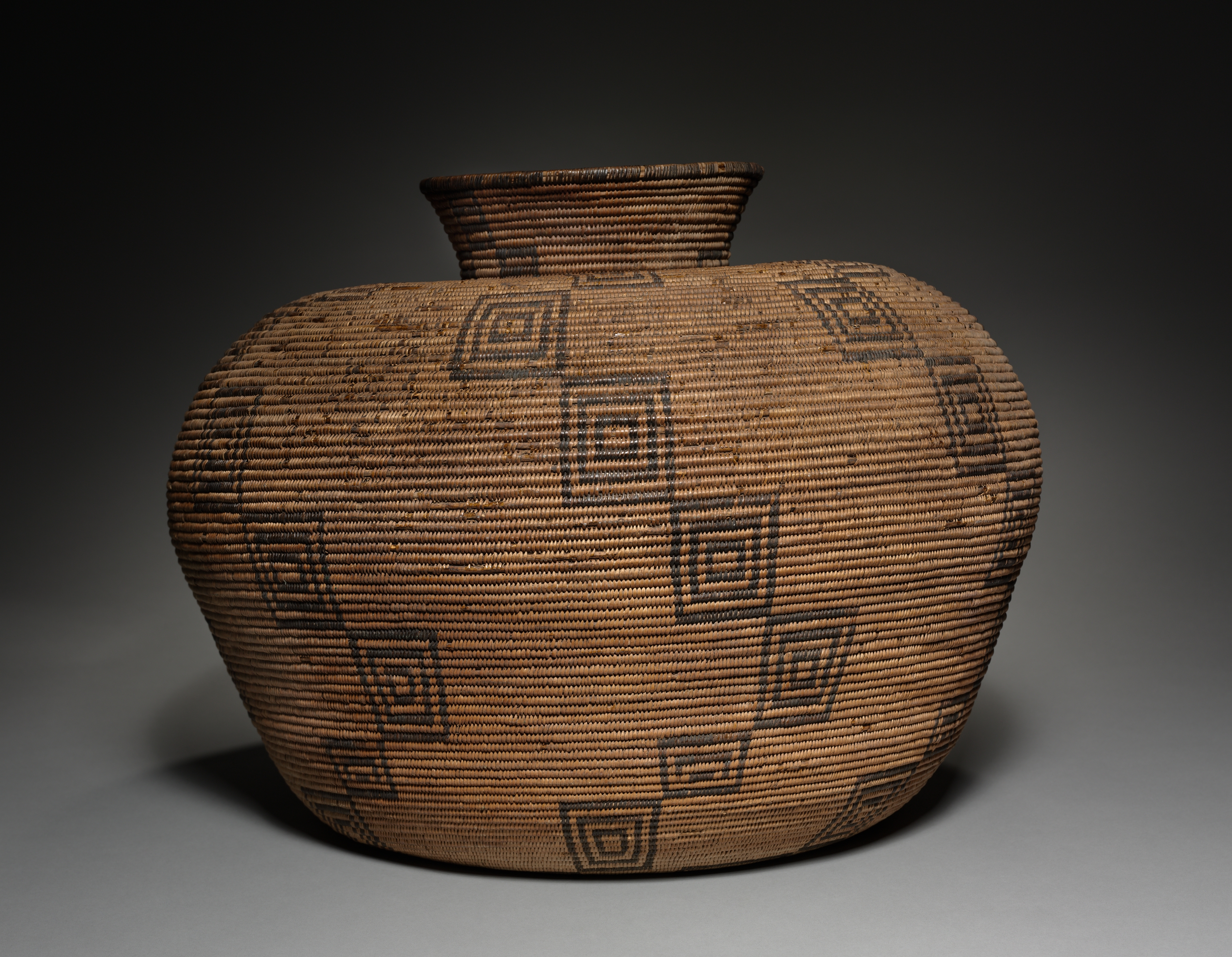 The Grain Storage Basket by the artist is a large, rounded woven basket with horizontal ribs. The basket features a short, narrow opening at the top and a pattern of black squares outlined with black lines. The basket's body has a rounded shape, wider at the middle than at the top or bottom. The background of the image is dark gray, with the basket casting a shadow on the surface below.