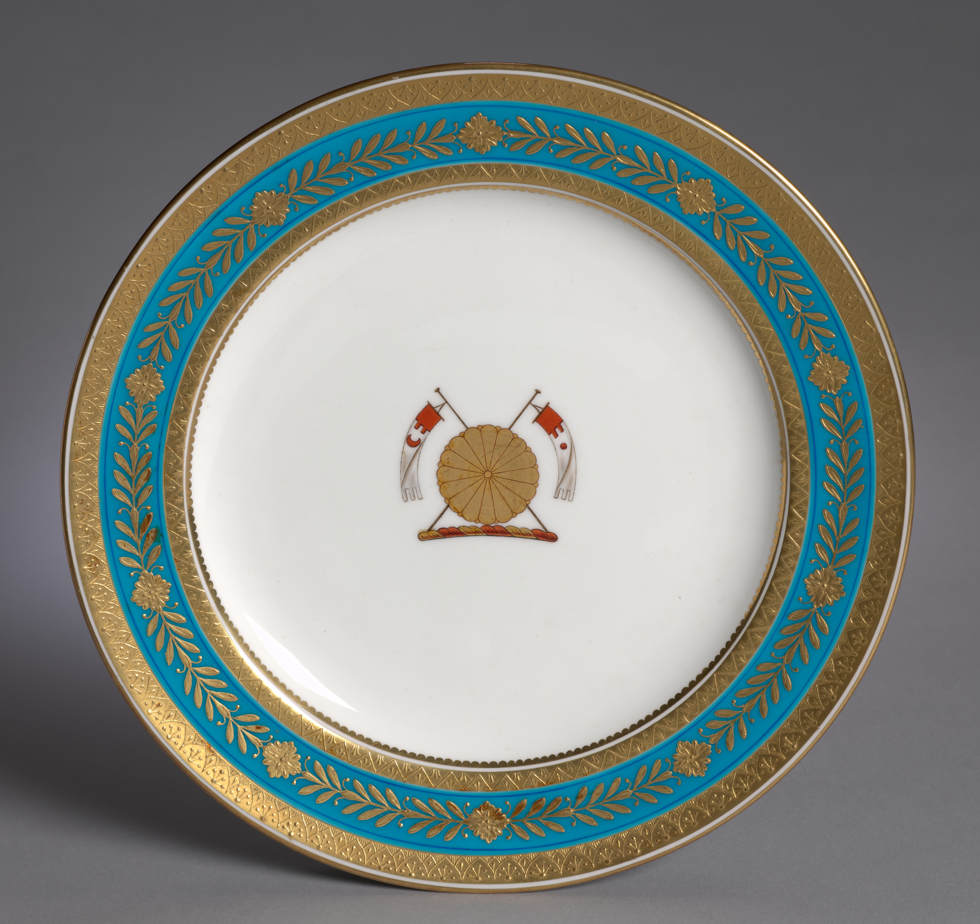 Round plate with a white center. The center has crossed flags on either side of a wheel design. The flags have white, red, and orange color. A blue and gold rim surrounds the white center. The blue portion has a gold floral design. The gold portion has a crosshatch pattern.