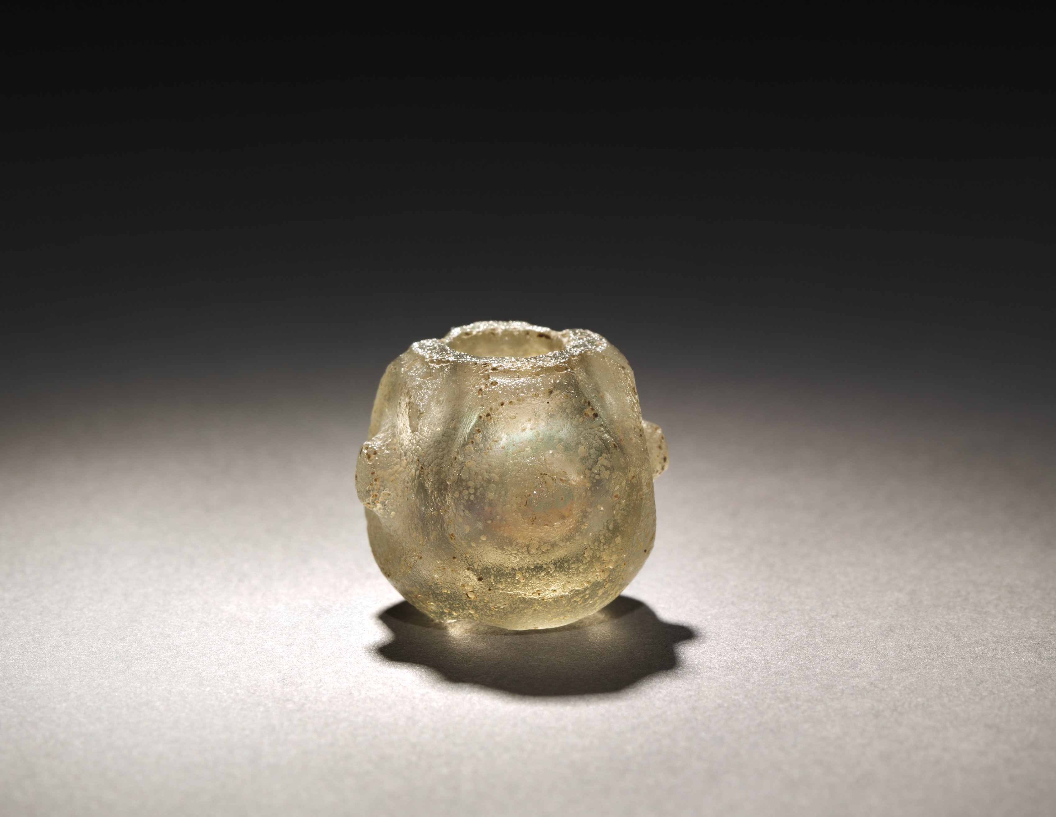 Miniature Reliquary by an unknown artist depicts a small, translucent, pale yellowish-green glass vessel. The object is rounded and roughly spherical in shape. It has a small opening at the top with a rough edge. The surface of the vessel appears to have imperfections and small bubbles. The base is flat and the object has small protrusions on either side. The object casts a shadow on a light gray surface against a dark background.