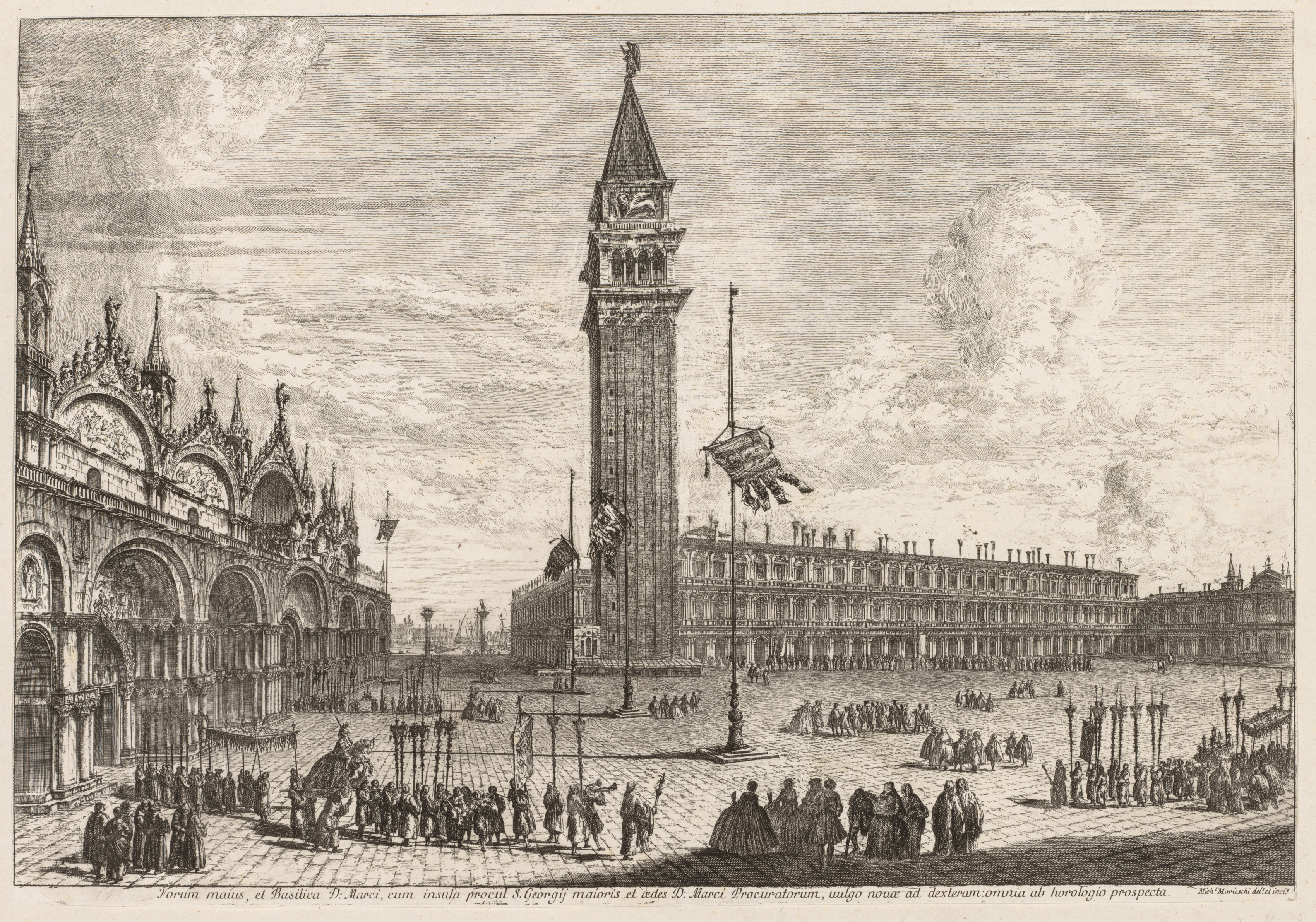 Black and white image of a large public square. The square has a large tower with a clock and a pointed roof in the center. The tower has a flag hanging from it. There are several buildings around the square, including one with many arches on the left side. The building on the left has a detailed facade with statues and ornate details. There are people walking around the square, some on foot and some on horseback. The people are dressed in old-fashioned clothing. The sky is cloudy. The image is titled "Views of Venice: Piazza and Piazzetta" and is by Michele Marieschi. The image is an etching.