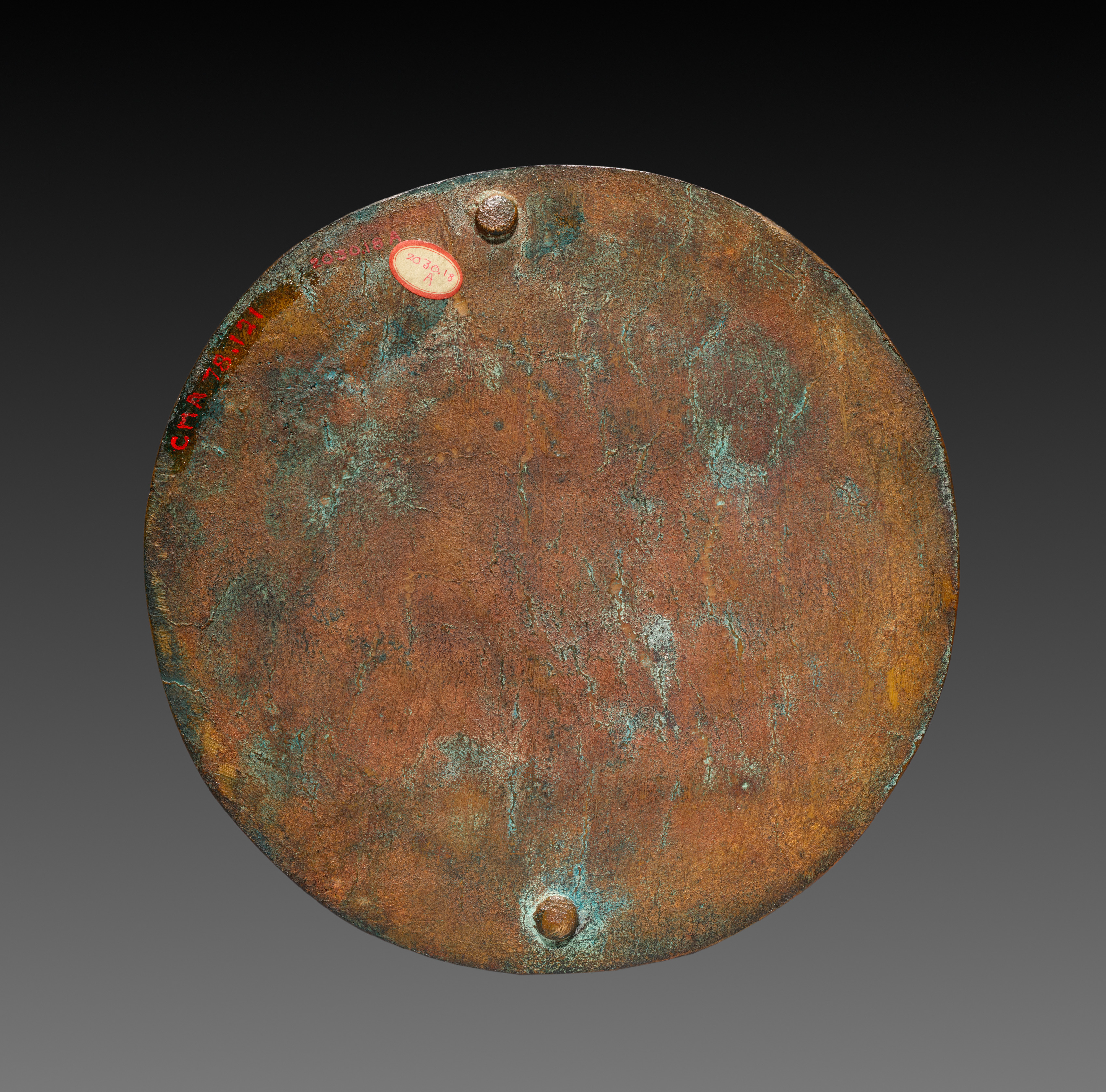 The medal is round and made of a copper-colored metal with a green patina. The surface is scratched and has visible wear and tear. In the top left quadrant, there are raised red letters that say "MUSEE CARNEGIE". Near the top center, there is an oval sticker with a red border and black and red writing. The top and bottom have small raised circular bumps. The background behind the medal fades from black to gray. The medal is titled "Medal: Loïe Fuller (reverse)" by Pierre Roche.