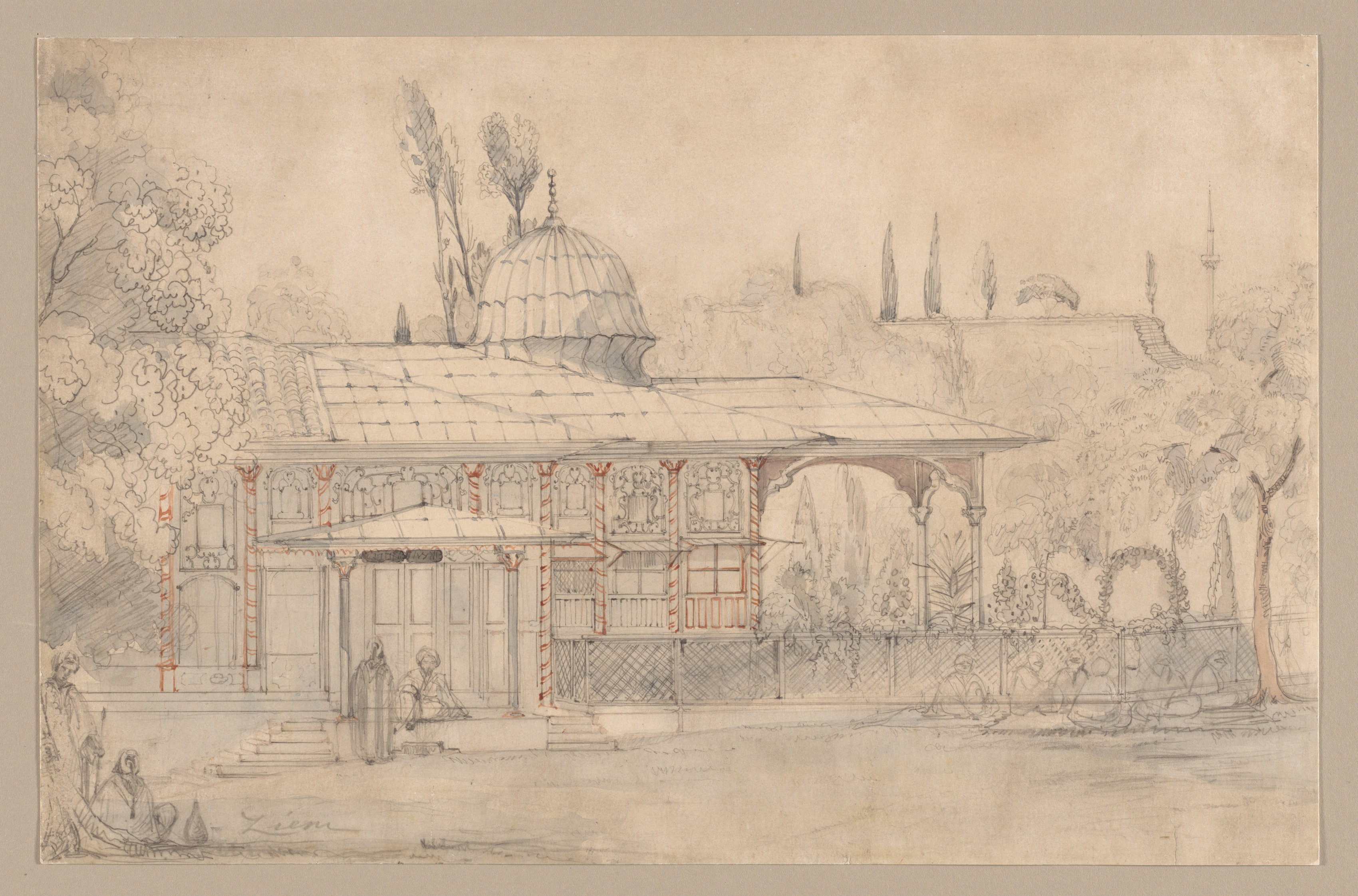 Sepia-toned drawing of a building with a tiled roof and ornate details. The building has a covered porch with columns and a railing. A dome-shaped structure is visible behind the building. People are sitting on the steps and in front of the building. Trees and bushes surround the building. A fence and gate are on the right side. The sky is light-colored. The building has red and white striped columns. A signature is visible in the bottom-left corner.