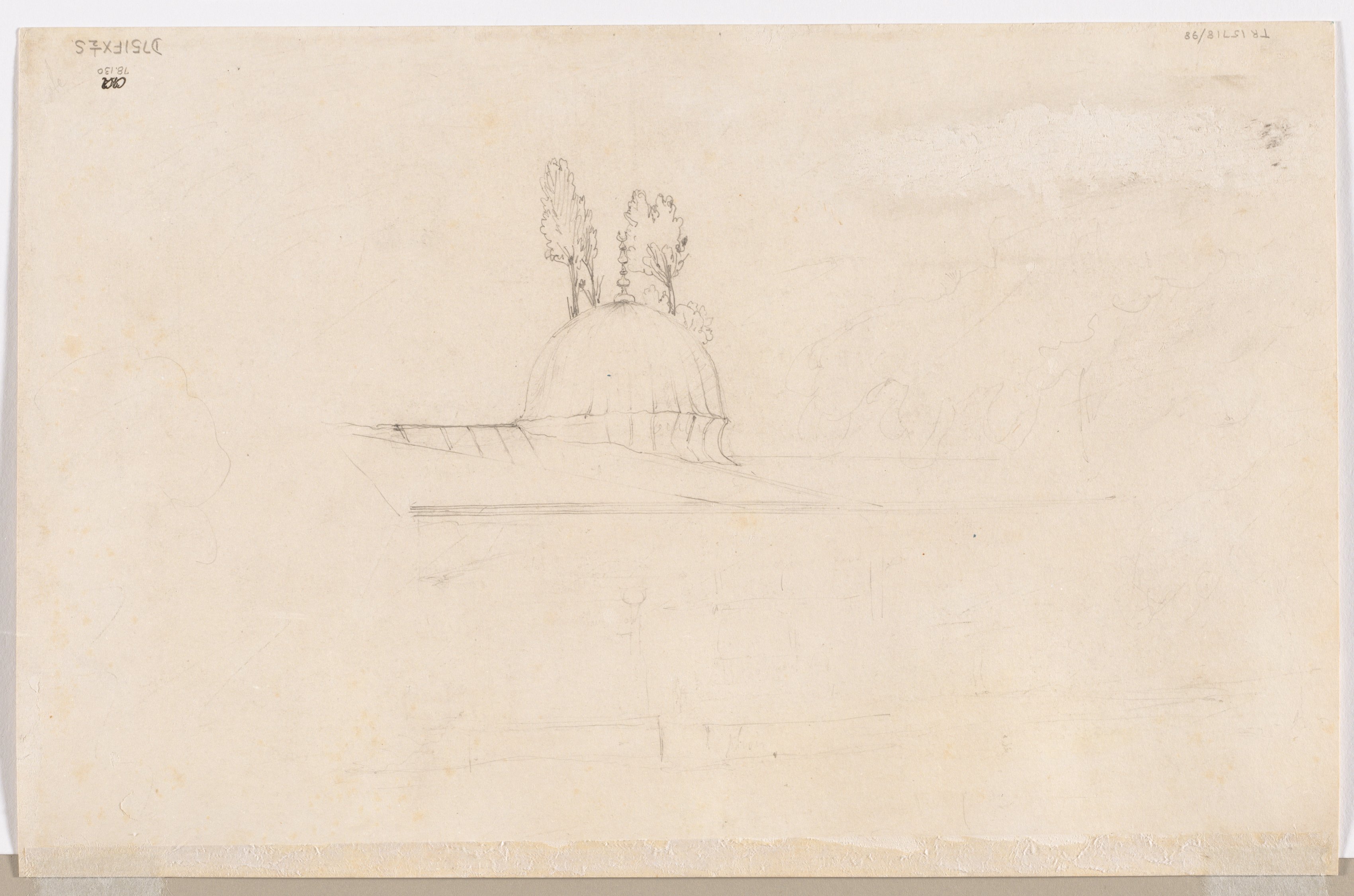 Beige paper with darker beige spots and frayed edges. A pencil sketch of a domed building with a flat roof and two trees on top. The roof of the building has lines going around its base. The background of the sketch is blank except for some faint pencil marks. Small writing in the top left and right corners.