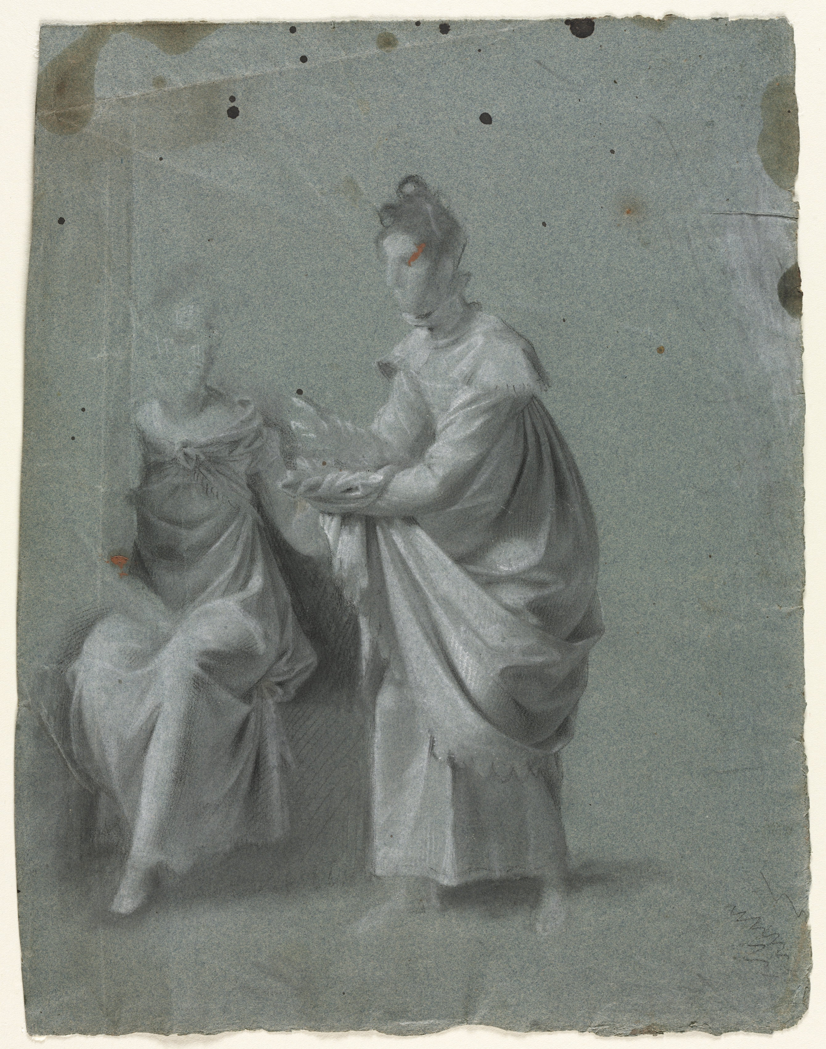 The image depicts two women. The woman on the left sits on a chair, wearing a long dress. The woman on the right stands, wearing a long dress and a headpiece. She appears to hold something in her hands. The background is a gray-blue color with darker spots and marks. The drawing appears to be in pencil or charcoal. The edges of the paper are rough and uneven.