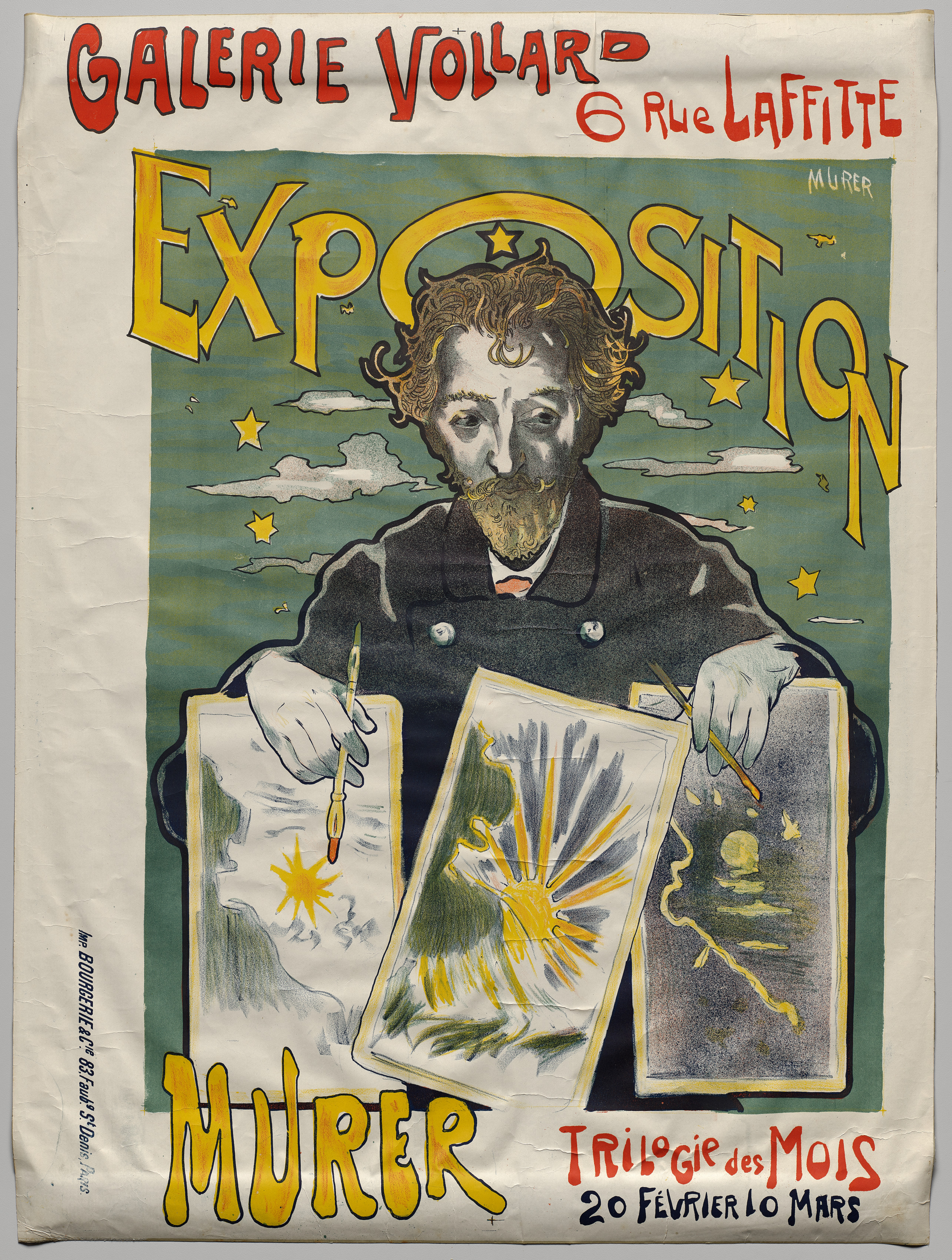 The poster features a man with curly, brown hair and a beard, wearing a dark-colored jacket. He holds two paintings in his hands. The man is positioned centrally, with his head and torso visible. The two paintings he holds are rectangular and oriented vertically. The left painting depicts a yellow star on a white background with gray clouds. The right painting shows a dark background with yellow and gray lines radiating from a central point. Above the man's head, the word "Exposition" is written in large yellow letters, with a yellow crescent moon and stars behind it. At the top of the poster, "Galerie Vollard 6 Rue Laffitte" is written in red letters. The artist's name, "Murer," appears in yellow letters at the bottom left, and "Trilogie des Mois 20 Fevrier 10 Mars" is written in red letters at the bottom right. The background of the poster is green with white clouds and yellow stars. The poster has a white border on the left side with small, illegible text.