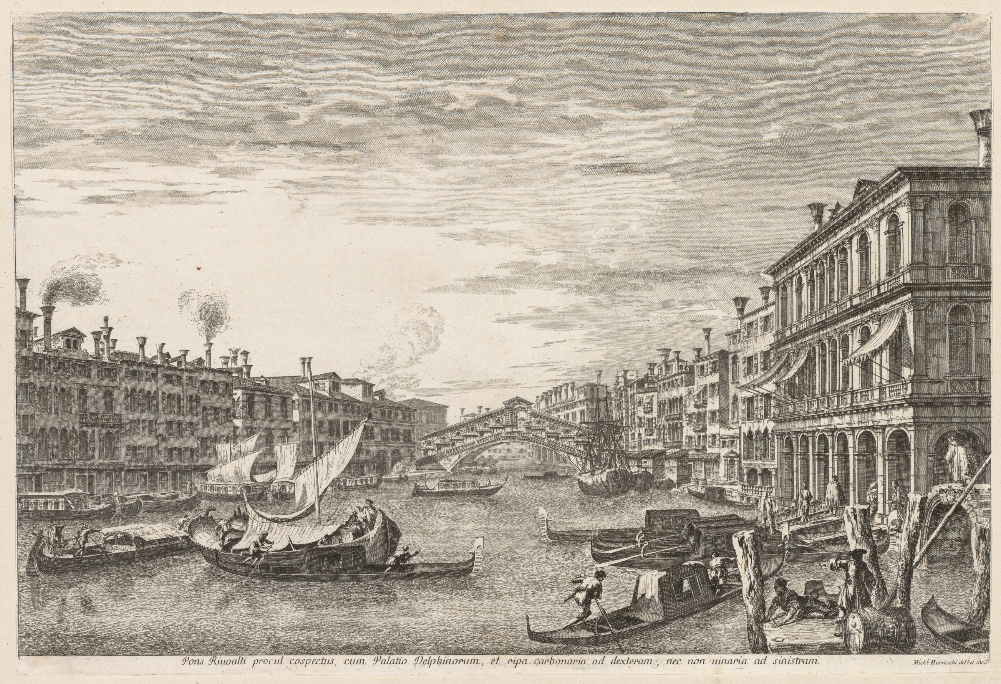 Black and white image of a canal with gondolas and buildings on both sides. A bridge spans across the canal. The image is titled "Views of Venice: Rialto" and is by Michele Marieschi. The sky is cloudy. There are several boats on the canal, including a large boat with a pointed bow on the left and gondolas on the right. There are people standing on the boats and on the shore. The buildings on both sides of the canal have many windows and chimneys. The buildings on the right have awnings over the windows. There is a barrel on the shore on the right. The image is drawn in a detailed, realistic style.