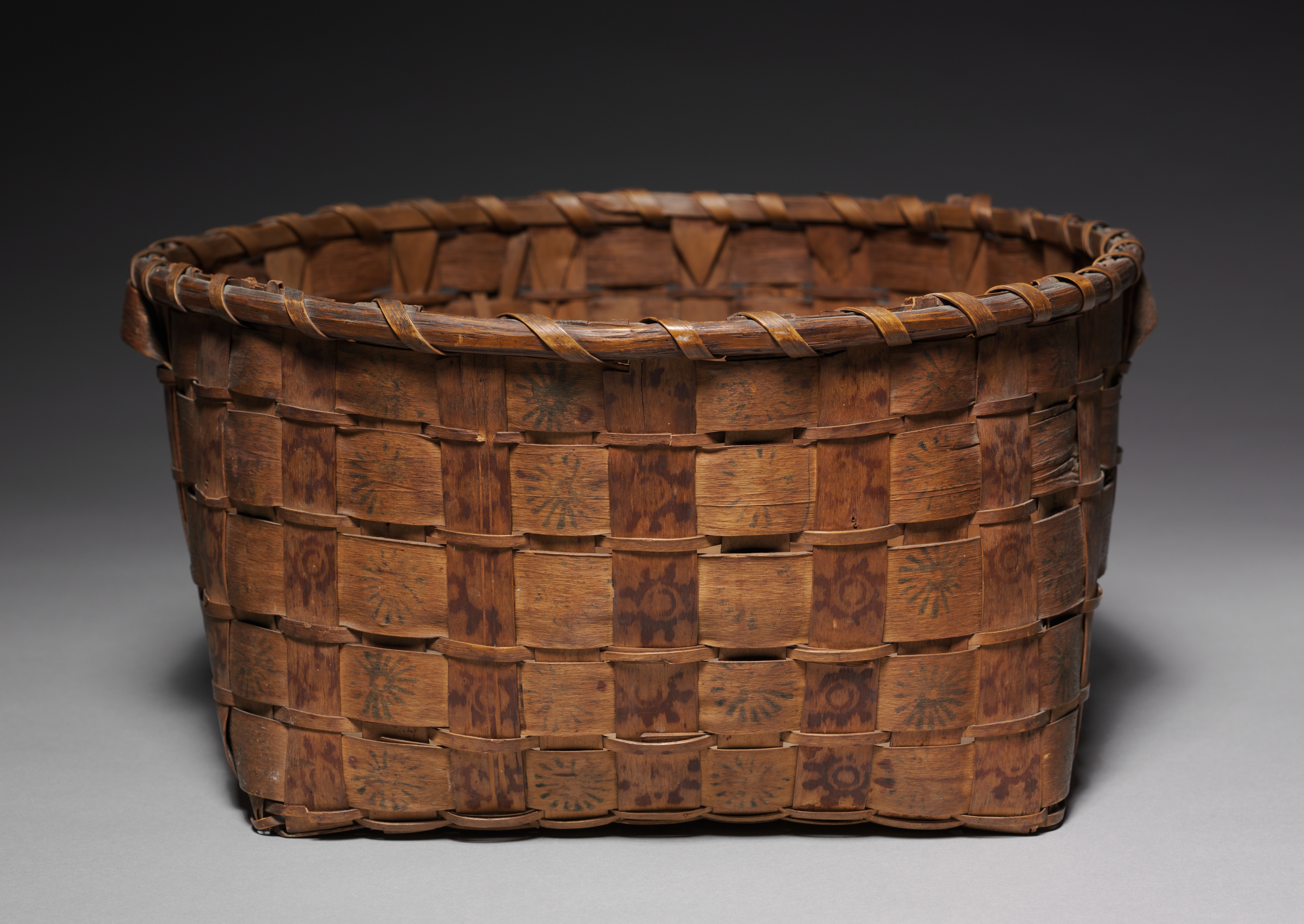 Brown woven basket with stamped decoration, rectangular shape, rounded corners, darker brown stamped designs on the woven strips, two layers of woven strips, rim wrapped in thicker strips, on gray background.