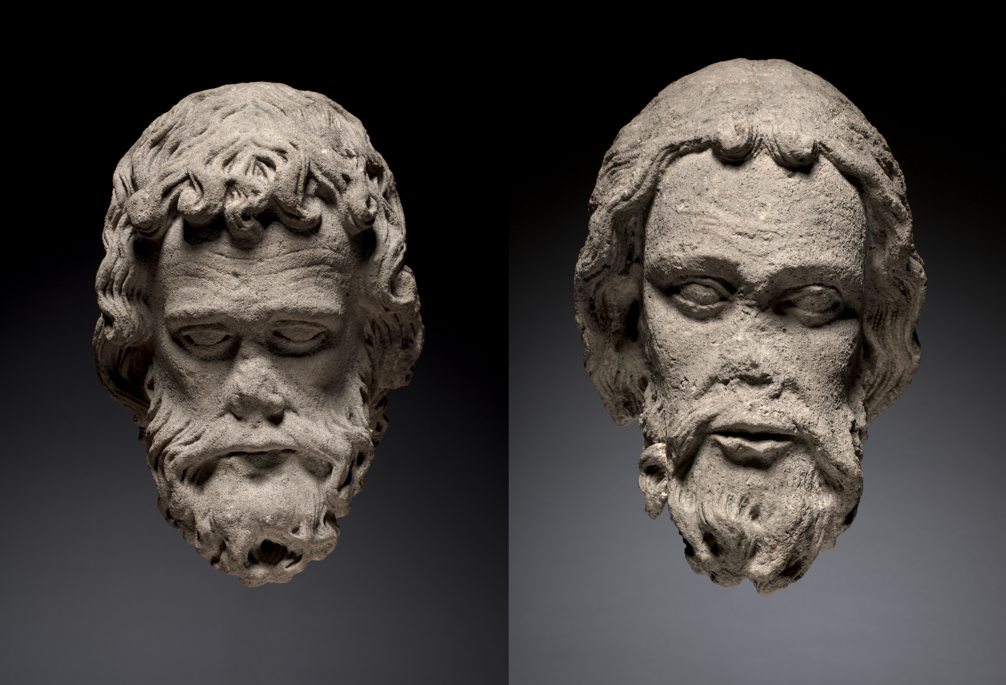 Two stone sculpted heads of men with beards. The heads are shown from the top, with the faces pointing downwards. The head on the left has curly hair and a full beard. The head on the right has straight hair and a less full beard. The heads are gray and appear to be made of stone. The background is black at the top and fades to gray at the bottom. The heads appear to be from an old building based on their style. They are likely from the South Portal of a cathedral. The style appears to be Gothic. The faces are stern and serious.