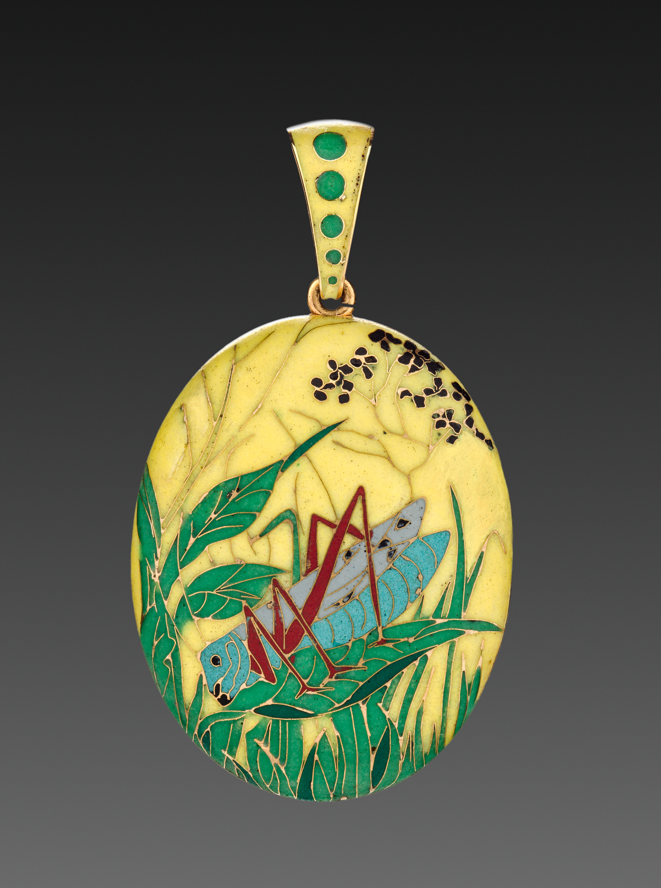 Round gold pendant with a bail featuring three emeralds. The pendant has a butterfly with blue and red wings and green leaves and stems on a gold background. A cluster of black flowers is present on the top right.