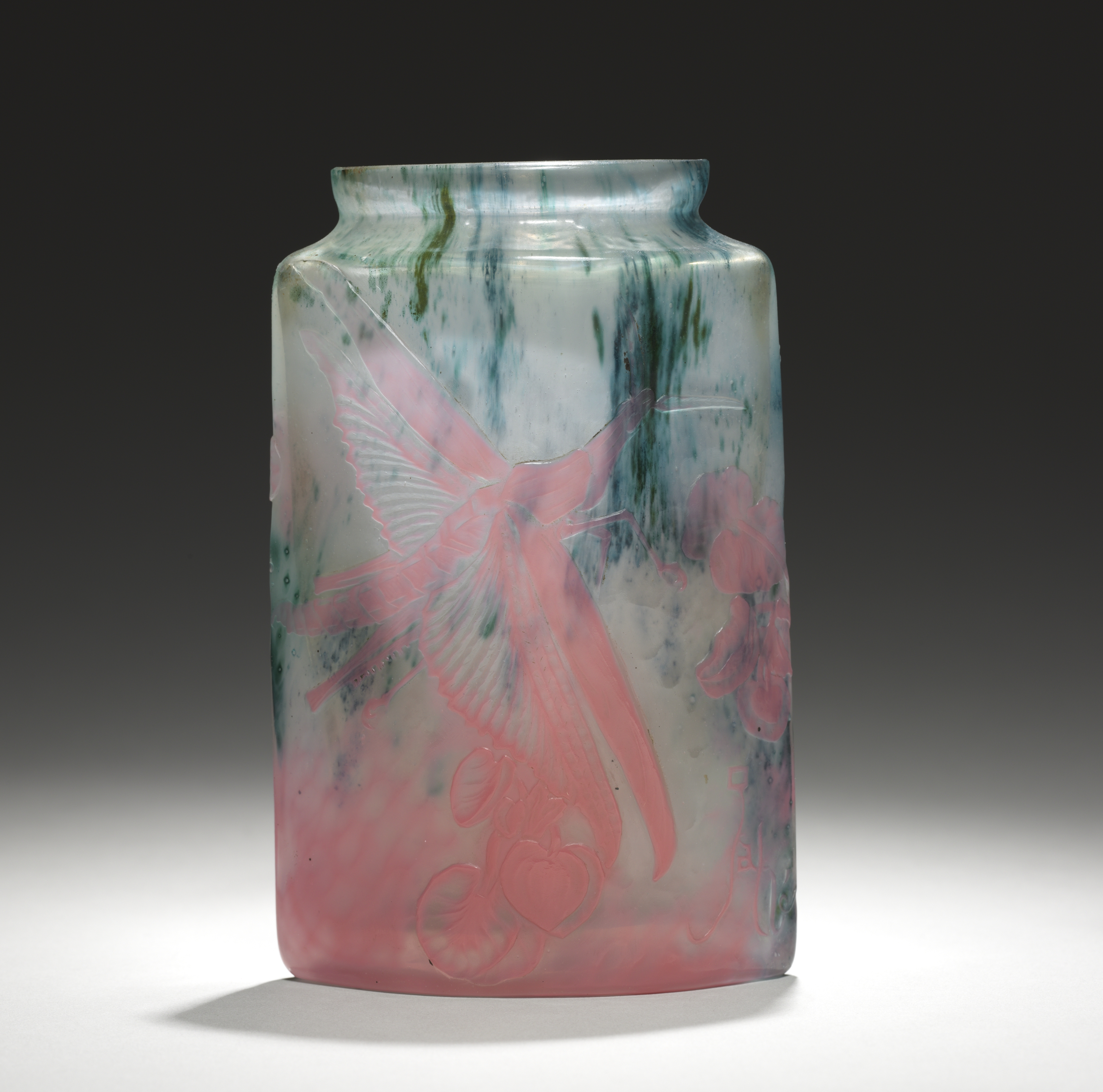 Vase by Emile Gallé. The vase is made of semi-transparent glass with a wide mouth and a narrow, rounded lip. The body of the vase is cylindrical with straight sides. The vase features a pink and green color scheme. There are pink flowers and leaves etched into the vase. A bird in flight is etched on the front. The background of the vase has a white base color with green vertical streaks. The pink coloration at the bottom fades to white at the top. The background behind the vase is dark gray to black, fading to white at the bottom.