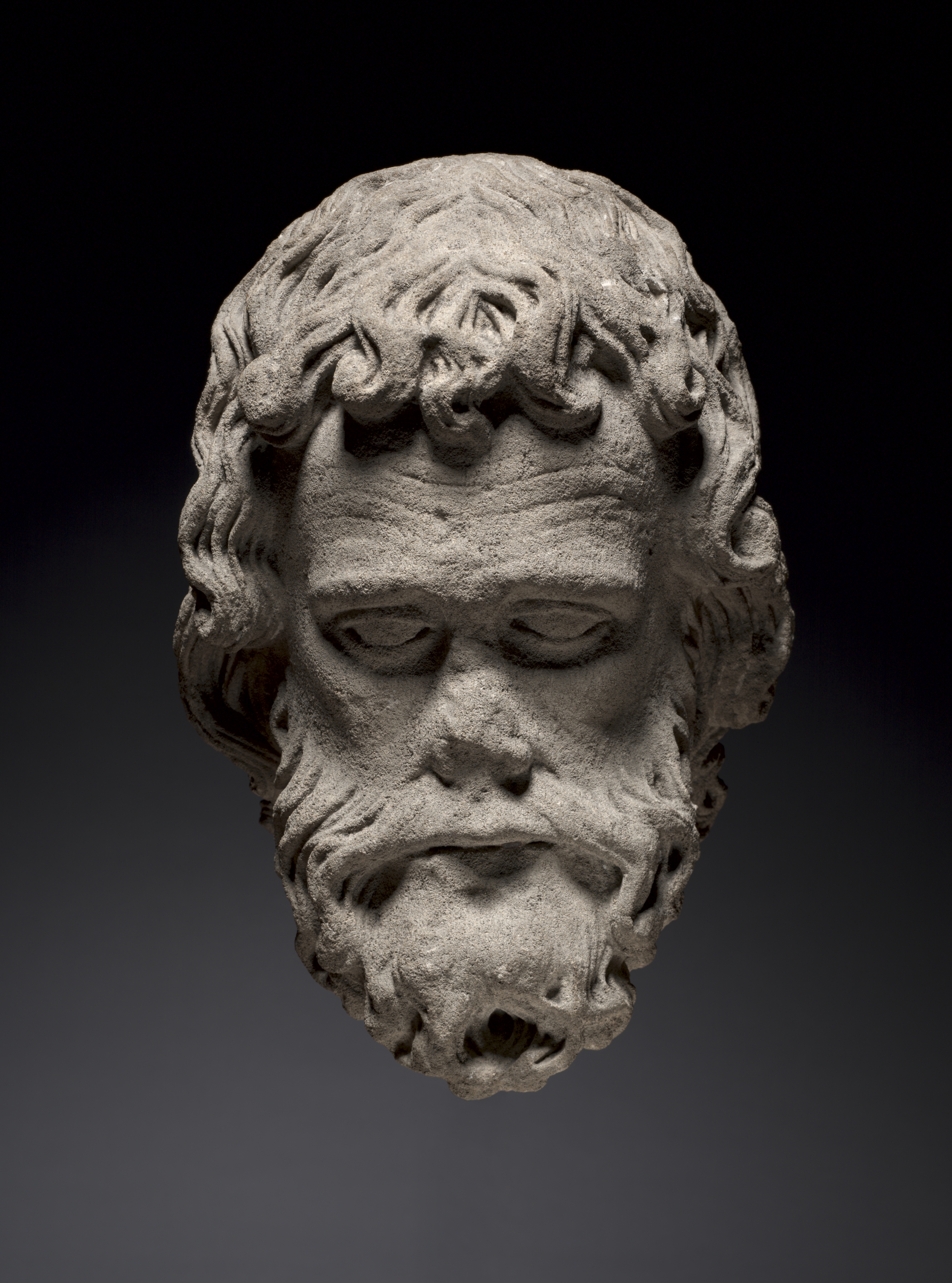 Stone sculpture of a man's head with curly hair and a beard. The man's eyes are closed. He has deep wrinkles on his face. The background is dark gray to black.