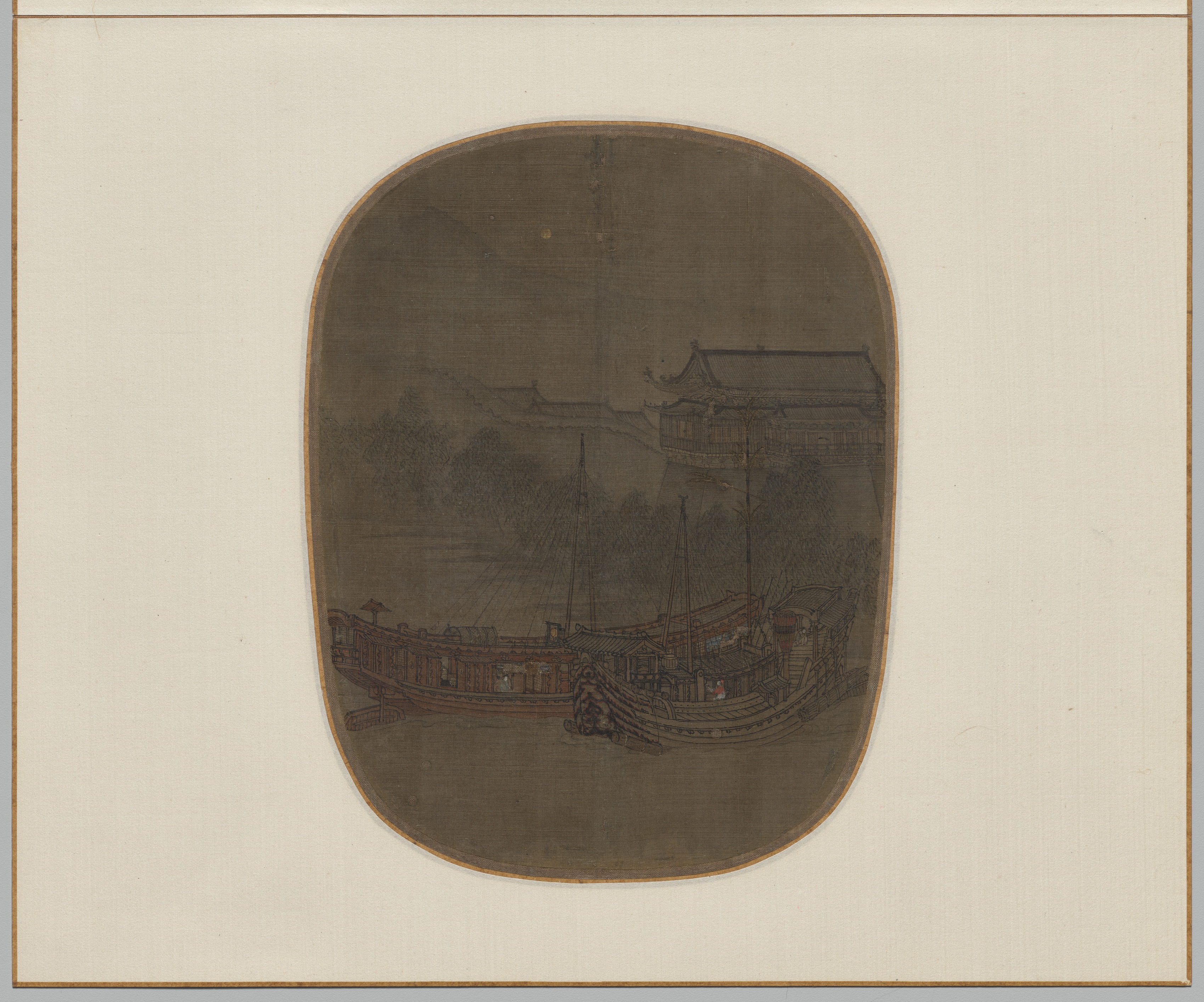 The painting depicts a scene by the lake. Two boats are anchored near a city gate. The boats have a covered area. The city gate has a tiled roof. There are buildings behind the gate. The background is dark. The painting is oval-shaped and appears on a beige background. The painting is titled "Boats at Anchor on West Lake at the City Gate" and is by an artist.
