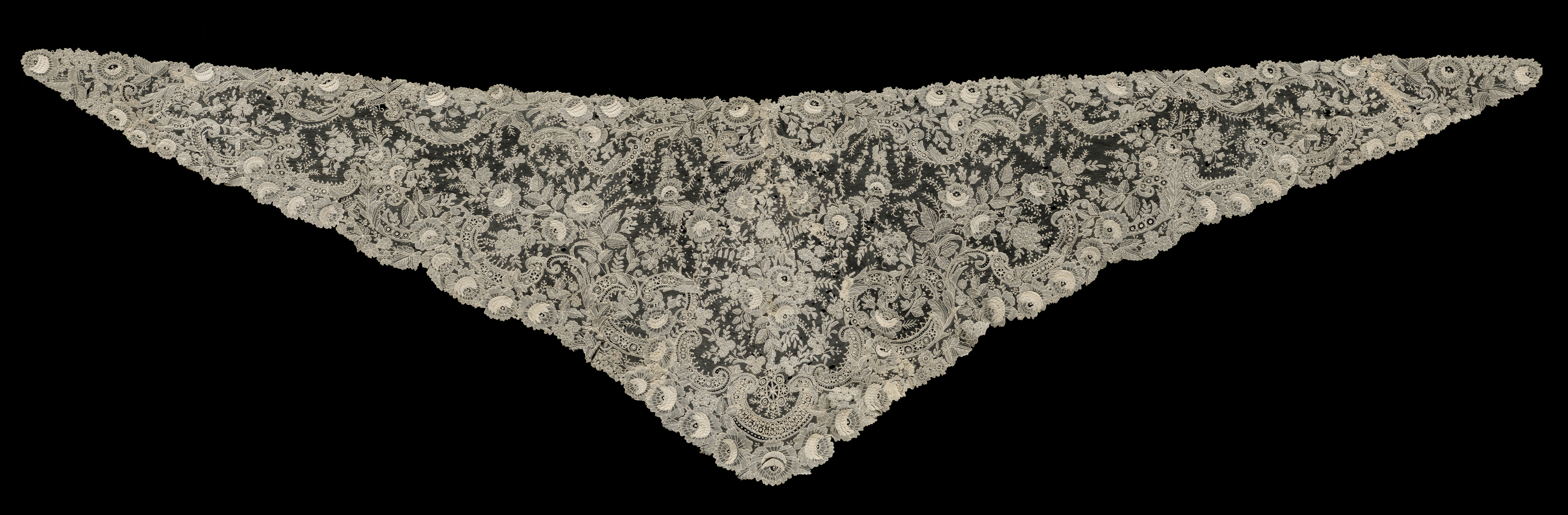 The image shows a triangular-shaped decorative piece. The decorative piece is a light beige color with a floral pattern. The floral pattern comprises small flowers, leaves, and stems. The piece has a lace-like texture and is symmetrical about the vertical axis. The lace-like piece tapers to a point at the bottom. The background of the image is black. The decorative piece appears to be a stole, specifically a Needlepoint (Point de Gaze) Lace Stole.