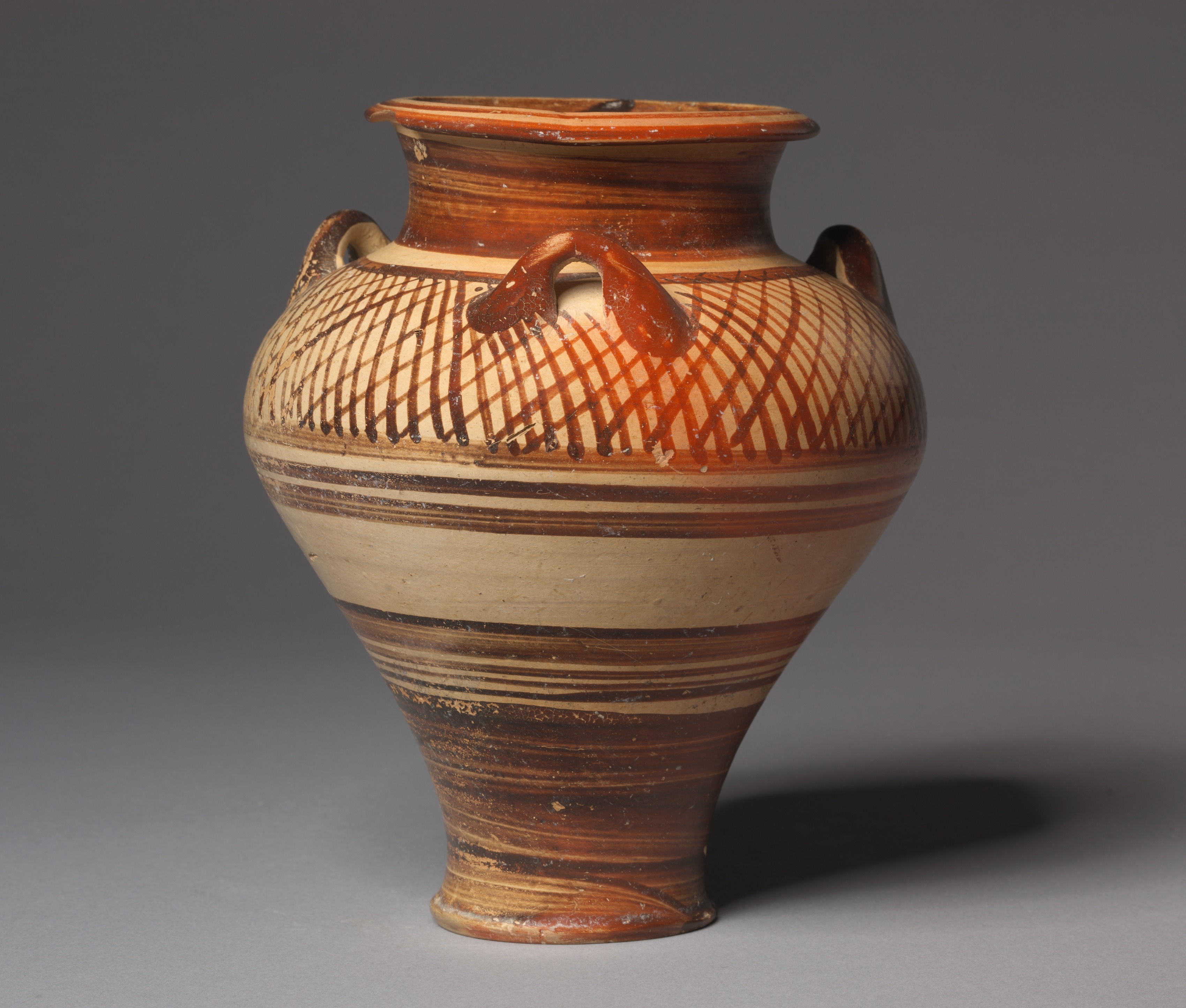 The image shows a piriform (pear-shaped) jar. The jar has a narrow base and a wide body with a short neck and a flared rim. The jar's base and lower body are narrower and taper to the bottom. The color scheme of the jar is predominantly shades of brown, beige, and tan. The jar has a tan and dark brown stripe around the middle. There are two handles on either side of the jar. The jar features crisscross and horizontal line designs. The background of the image is dark gray. The jar casts a shadow on the surface below it. The jar's design is characteristic of ancient styles. The jar appears to be made of clay.