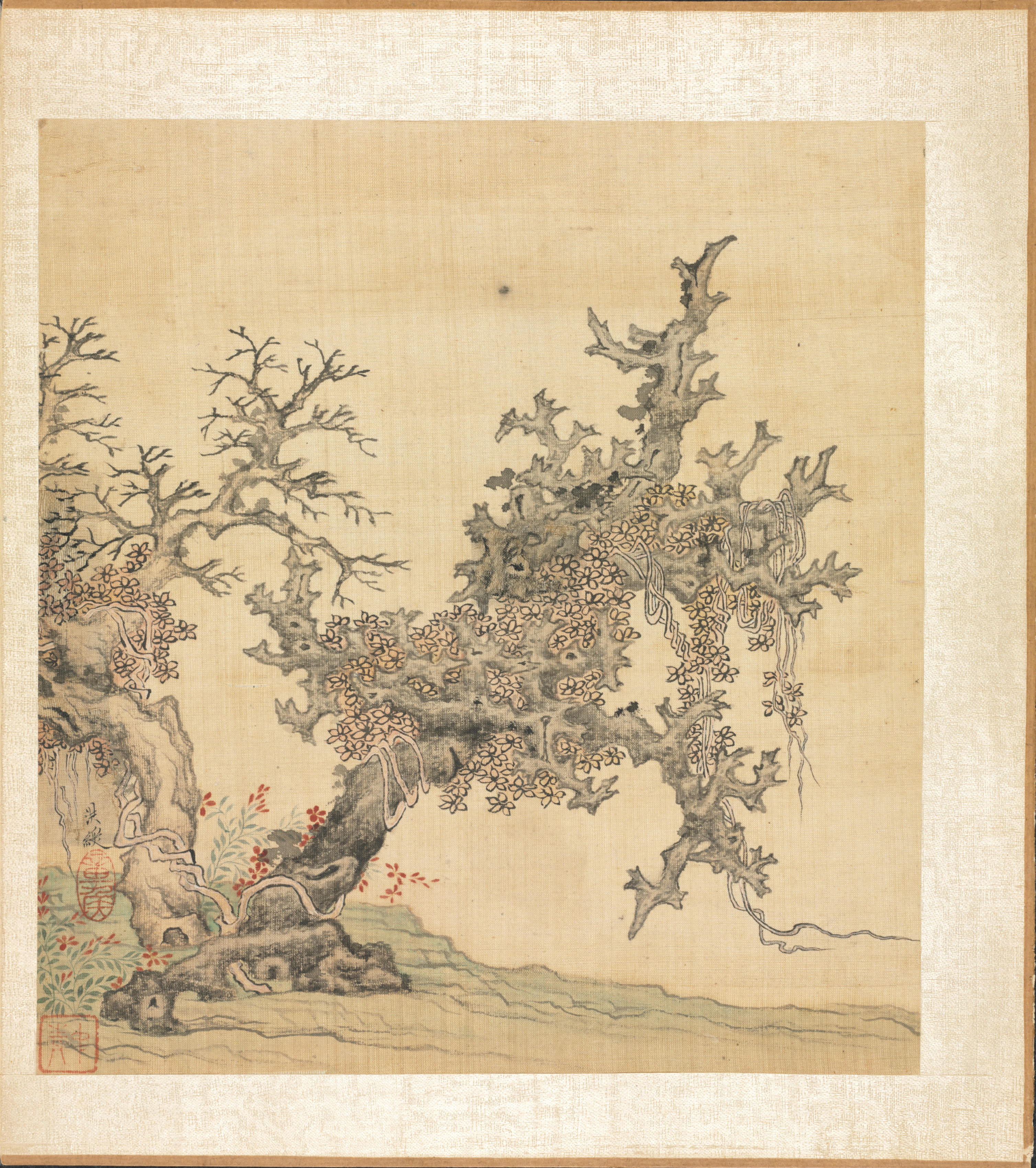 Paintings after Ancient Masters: An Ancient Tree by Chen Hongshou. A tree with a large, twisted trunk and branches, many of which are bare. The tree has a thick trunk with a rough texture and several large branches that curve upwards. The branches are adorned with clusters of small yellow flowers. The base of the tree has several smaller plants with red flowers growing around it. The background is a light yellow color. The painting has a border around it that is white on the outside and brown on the inside. The painting appears to be on a beige fabric background.
