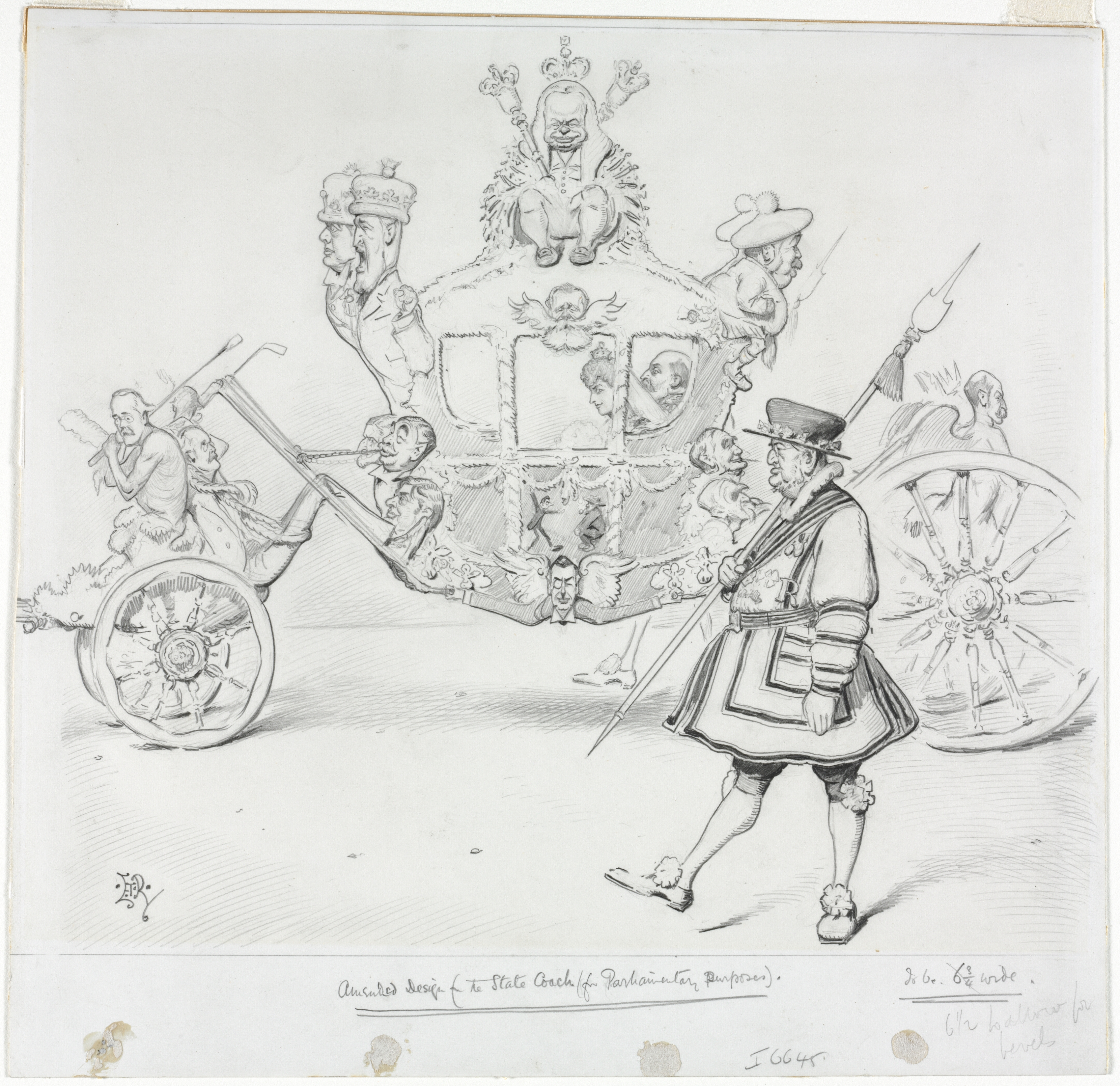 A black and white pencil drawing of a horse-drawn carriage. The carriage body is ornately decorated with a crest on top and coats of arms on the sides. A crowned figure sits on top of the crest. Two men dressed as coachmen sit on the left side of the carriage on the horses. A footman dressed in a uniform walks on the right side. Two large wheels are on the right side of the carriage. A man dressed as a guard walks on the right side; he carries a long spear. Several men's heads are caricatured on the side of the carriage. A caption under the drawing reads "Altered design f. the State Coach f. Parliamentary Purposes".
