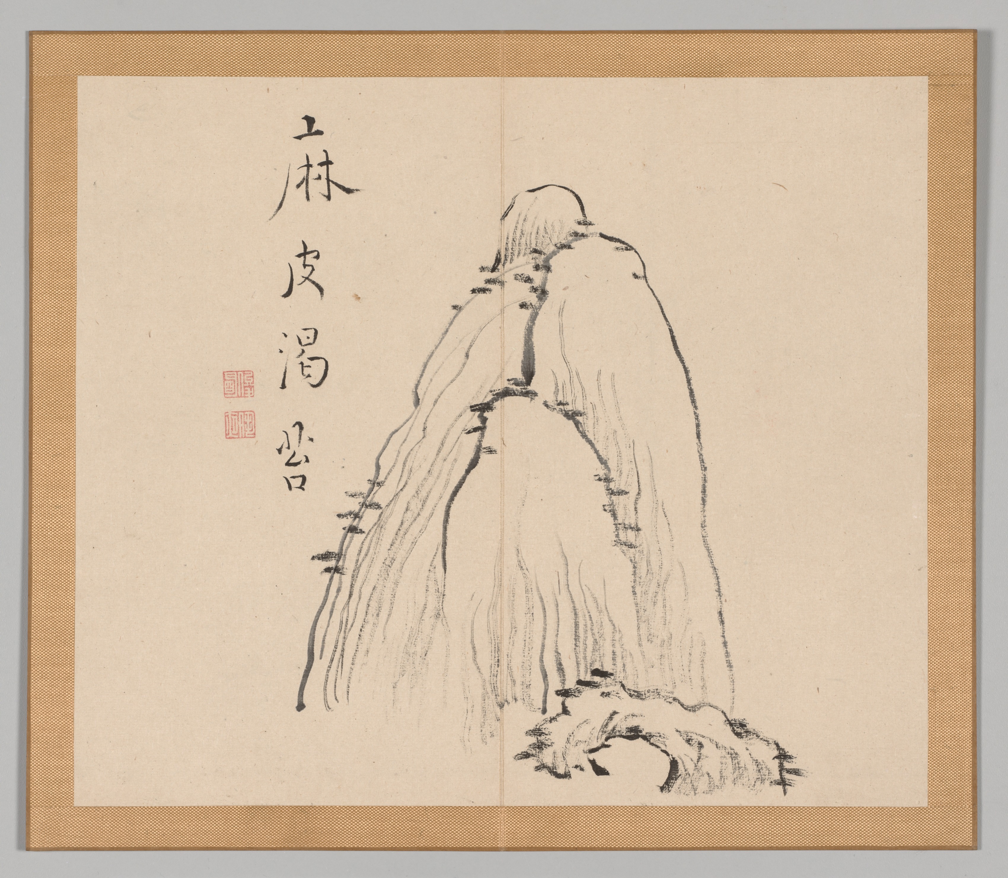 The image depicts a black and white sketch of a mountain on aged paper with a brown border. The mountain is drawn in black ink and is positioned on the right side of the paper, with its peak pointing upwards and its base at the bottom. The mountain has a rough texture, with many lines and crevices. On the left side of the paper, there are several lines of black Chinese calligraphy. Below the calligraphy, there are two red seals. The paper is beige and has a brown border around it. The background behind the paper is gray. The artwork is titled "Reverberations of Taiga, Volume 1 (leaf 10)" and is by Aoki Shukuya.