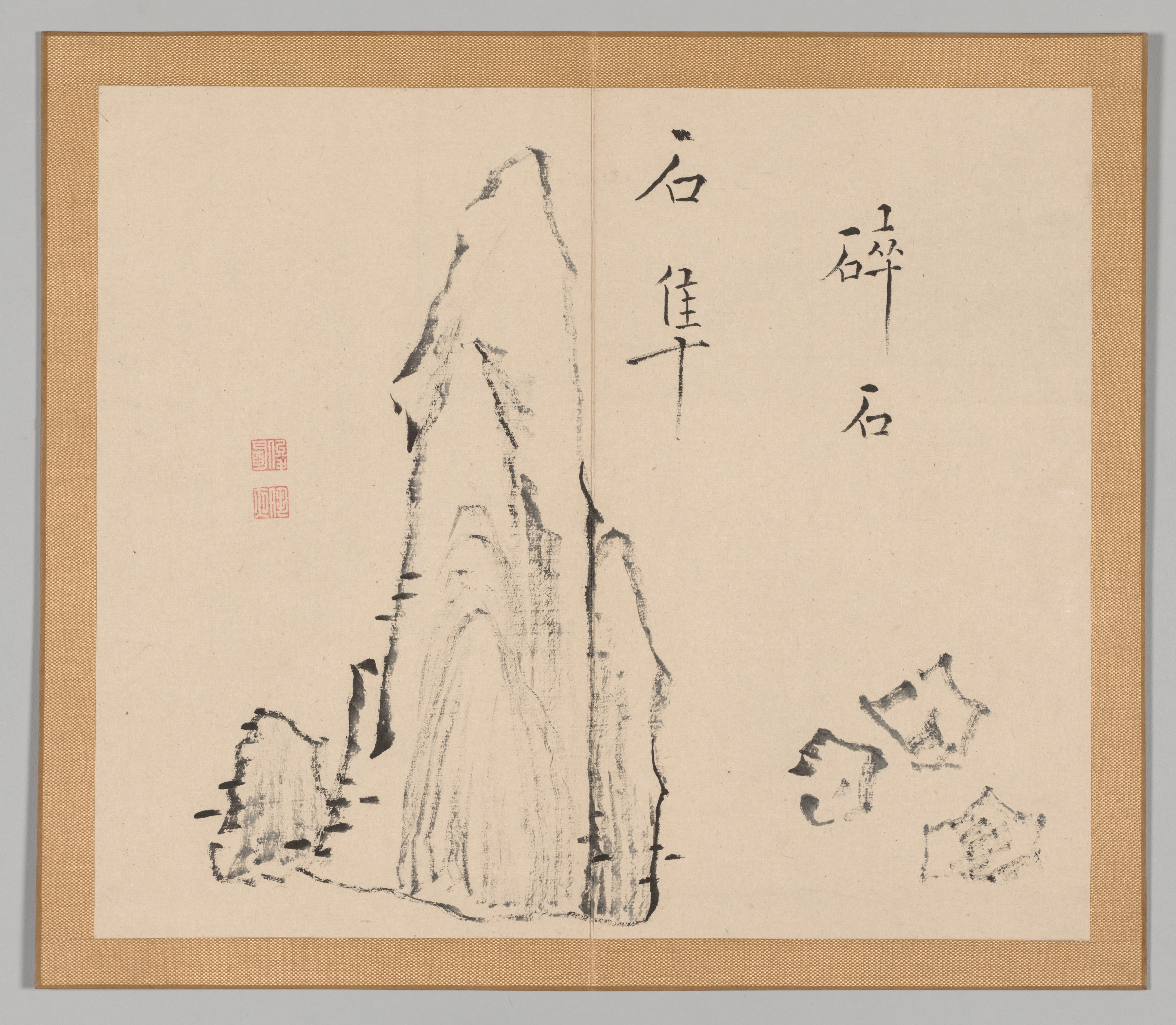 A painting of a tall pointed rock formation on beige paper with a brown border. The formation is drawn in black and gray ink on the bottom left with two small rocks on the bottom right. There are four Asian characters on the top right in black ink. Two small red stamps are on the left.