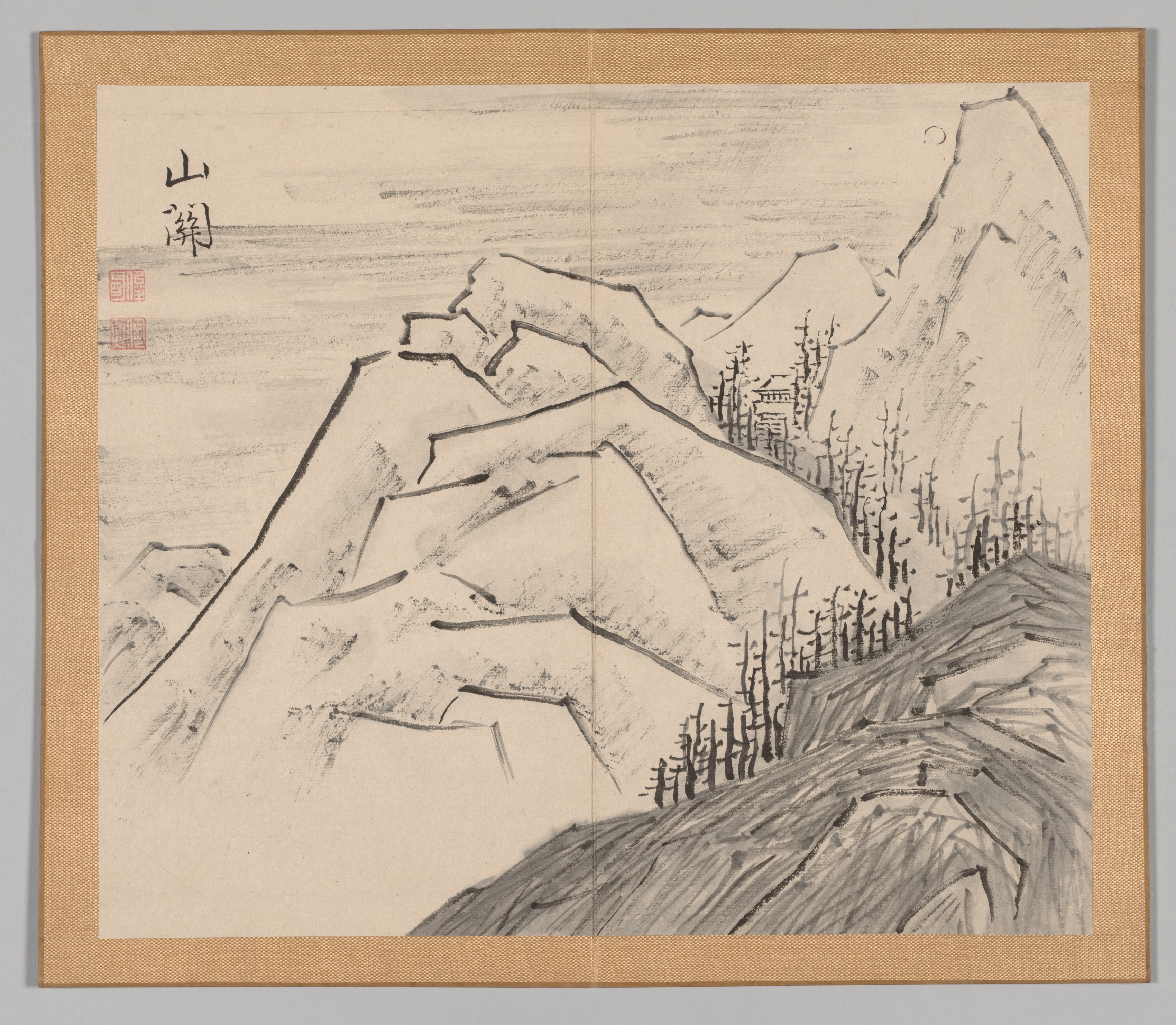 Black and white mountain landscape drawing on beige paper with a brown border. A cluster of trees on the right and a building on the top center. Two sets of Asian characters are written in black and red ink. The mountains are drawn with a range of lines and shading.