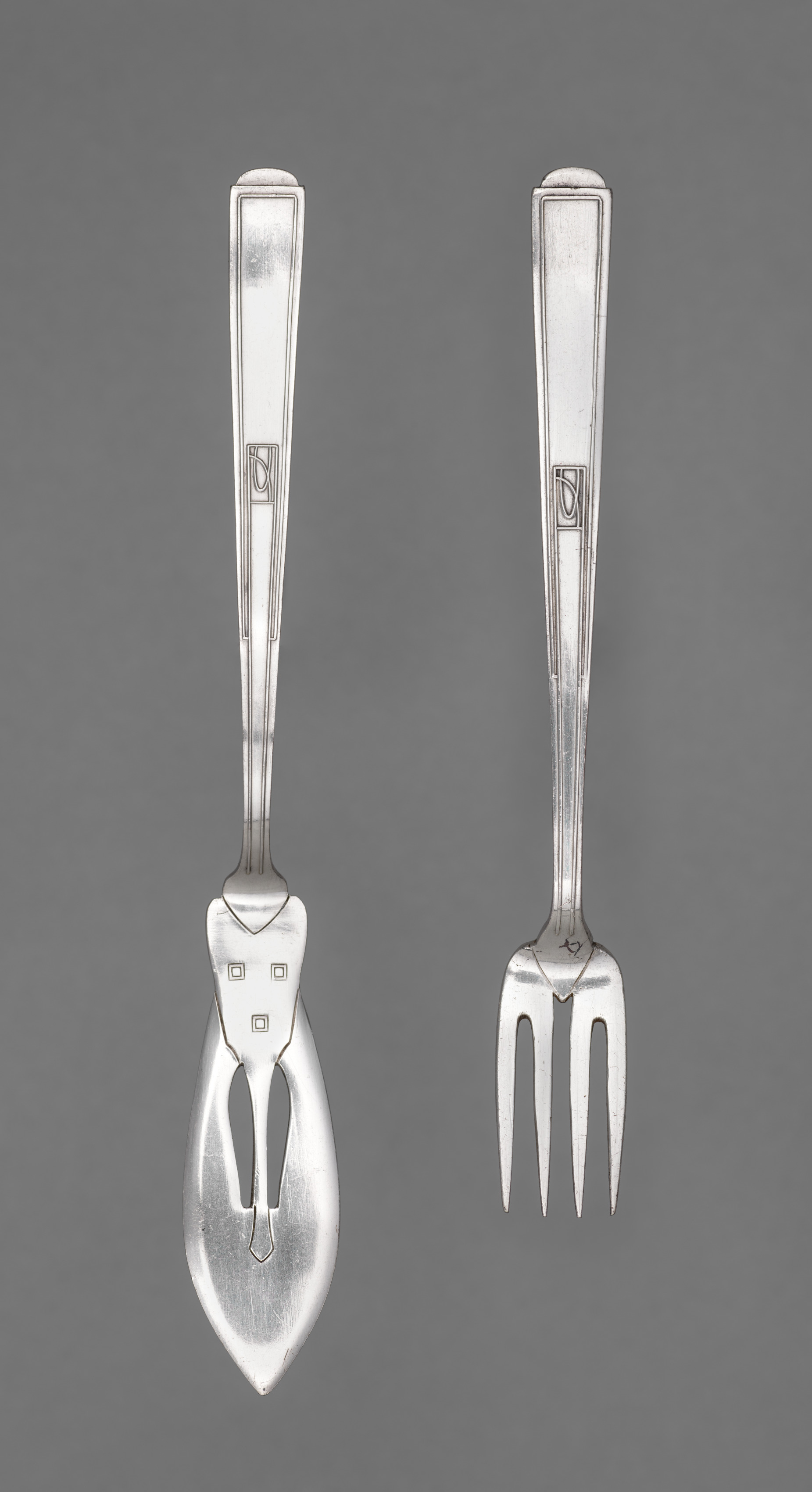 The image shows a fish knife and a fork by Josef Maria Olbrich. The fish knife handle is long and rectangular with rounded corners and a small decorative square near the top; the blade part has a pointed tip and a curved edge. The fork has a similar handle and three prongs. The handles are positioned vertically, with the blade and prongs pointing downwards. The background is a solid grey color. The utensils are made of metal and appear to be silver or chrome. The fish knife and fork are side by side.